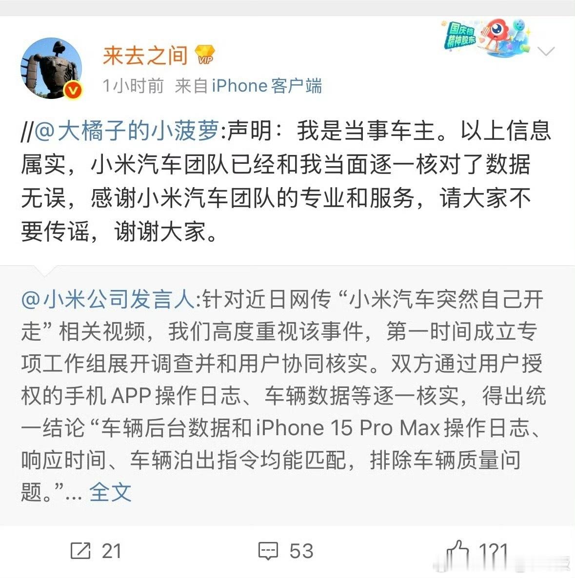 小米公司发言人回应官方给了调查结果,证明是手机遥控泊车(手机离车十米内),车主本人也承认是闹了乌龙。