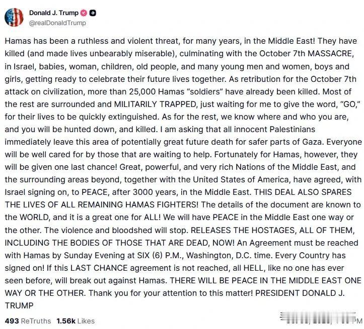 美国总统特朗普已设定10月5日晚上6点为哈马斯同意其和平计划的最后期限,并警告称如果哈马斯未能遵守,“地狱般的打击将降临在哈马斯身上”。 美国施压哈马斯 特朗普沙特协议 哈马斯之死 哈马斯撤军
