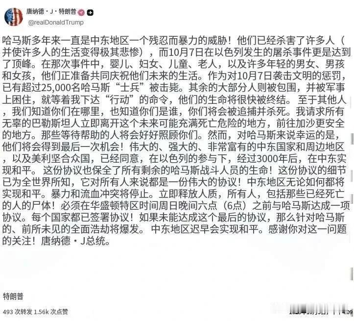 美国总统特朗普已设定10月5日晚上6点为哈马斯同意其和平计划的最后期限,并警告称
