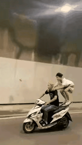 不作不死!大马路上,一个黄毛男子骑着摩托车,速度很快,他的后面还有一个穿着白衣服的男子,男子并没有好好坐着,而是半蹲在后座上,两只手放在前面黄毛的肩膀上。 两人边骑还边做着危险的动作,黄头发男子屁股一弹,脚使劲一蹬,然后两手使劲往上提车把手,想把车头翘起来,而后面的白衣男子则配合他的动作,使劲往后踩后座,第一次配合没成功。两人又来了第二次!第二次成功了但没骑多远,又来了第三次! 他们还时不时往后看,后面应该还有其他的小伙伴! 最后白衣小伙可能是想蹲下来,结果一个不稳直接摔到地上躺在那里一动不动,而黄头发的也被拖着摔倒了,也不知道情况怎么样! 看到最后一幕只能说一句活该。我不知道别人,反正我在路上看到这样的都是恨的牙痒痒的,他们觉得自己很酷。可在别人眼里他们是在找死! 信不信如果这样的被撞不犯法,很多司机都想直接撞上去!这是不拿自己的生命当回事,也是在危害其他人的生命! 他们就得狠狠地摔一次,最好是去半条命那种,才会长记性! 不能说他们的父母,这样的估计父母也管不住,有这样的孩子,父母估计平时也被气的不轻! 为啥这种交警都不管呢?