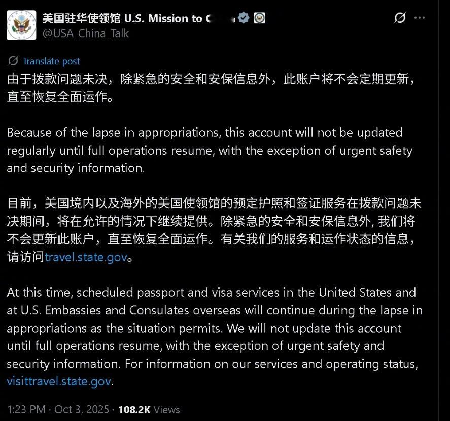 据环球时报报道,北京时间10月3日下午1时23分,美国驻华使领馆在美国社交平台X上的官方账号上宣布,由于拨款问题未解决,除紧急的安全和安保信息外,此账户将不会定期更新,直至恢复全面运作。