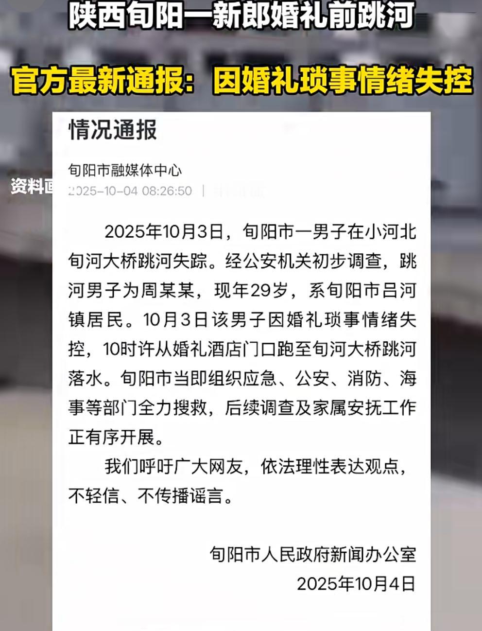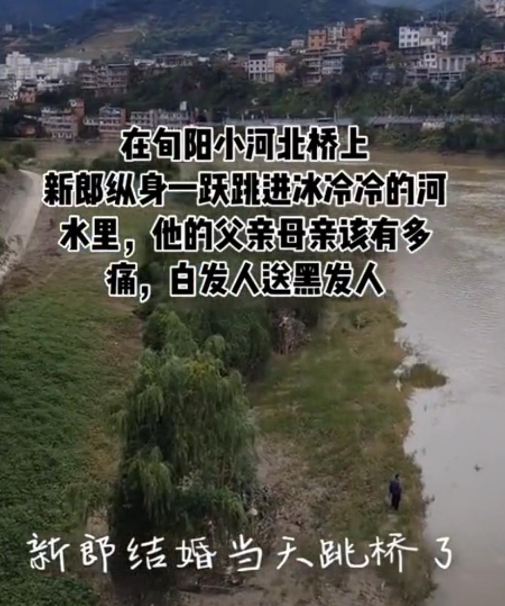 红事变白事!10月3日,网传陕西旬阳一位准新郎因婚礼琐事跳河,当前人还没找到。