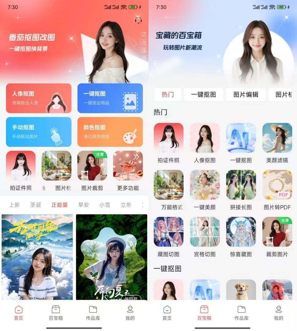 1. 番茄抠图改图番茄抠图改图app,手机里的魔法棒,随点随抠,多样物件轻松应对。快捷又不失细腻,边缘如新生般干净,让每一张图皆焕发别致魅力。