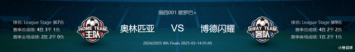 看法:奥林匹亚科斯尽管拥有主场优势并且面临翻盘的压力,然而主力球员的缺阵使得球队的进攻火力大打折扣,想要攻破博德闪耀的防线并非易事,从首回合表现来看,卡斯珀尔·霍格的梅开二度让博德闪耀在首回合取得3-0的领先,球队一只脚已经踏进了半准决赛,虽然次回合有作客出战的不利因素,但下定决心死守的博德闪耀,个人认为本轮客场还是有望不败抢分。