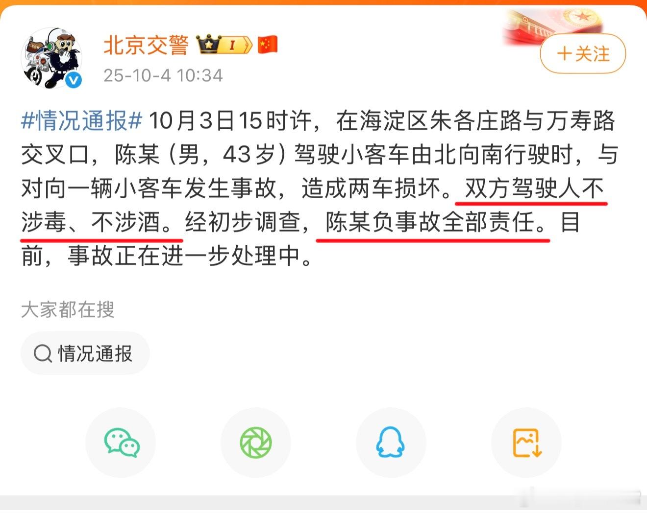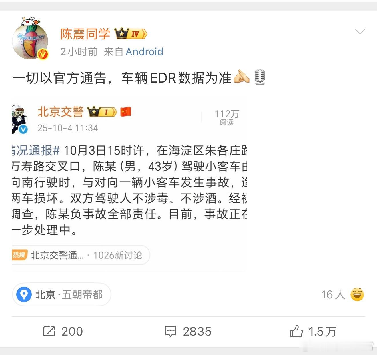 北京交警通报陈震发生车祸既然不涉毒、不涉酒且陈震全责的话,那基本上只会涉及到赔偿