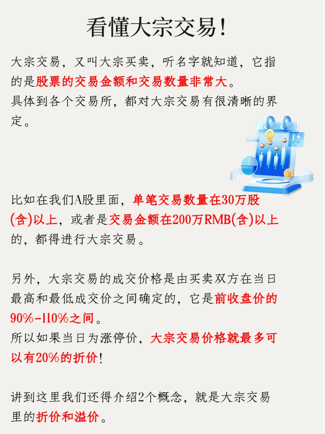 比如在我们A股里面,单笔交易数量在30万股(含)以上,或者是交易金额在200万RMB(含)以上的,都得进行大宗交易。