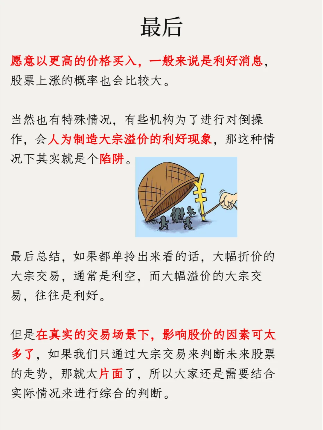 当然也有特殊情况,有些机构为了进行对倒操作,会人为制造大宗溢价的利好现象,那这种情况下其实就是个陷阱。