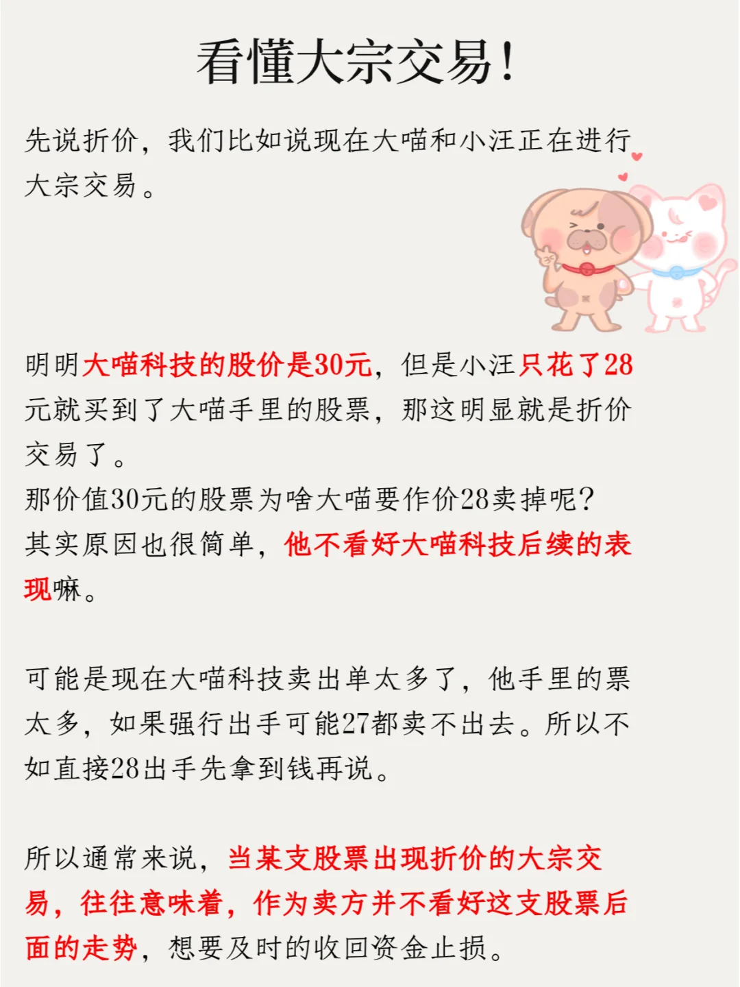 先说折价,我们比如说现在大喵和小汪正在进行大宗交易,明明大喵科技的股价是30元,但是小汪只花了28元就买到了大喵手里的股票,那这明显就是折价交易了。