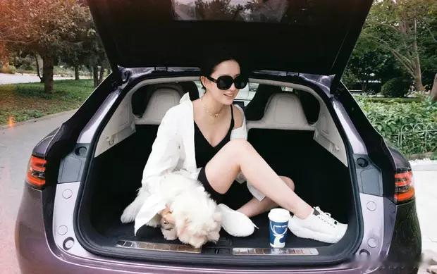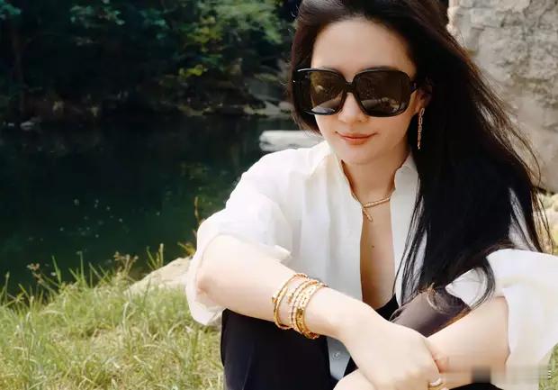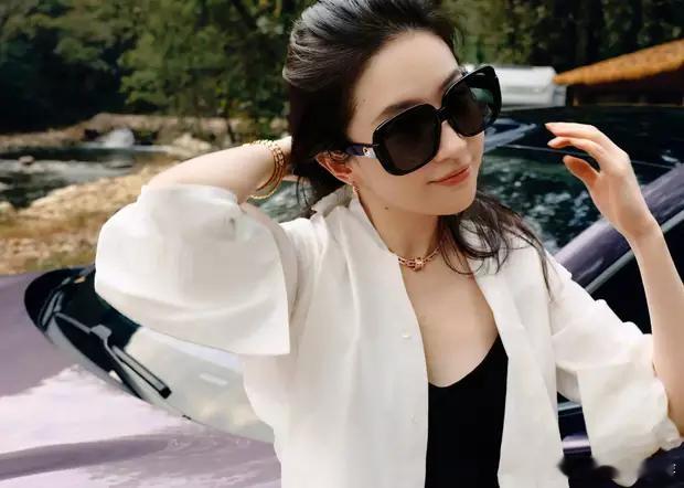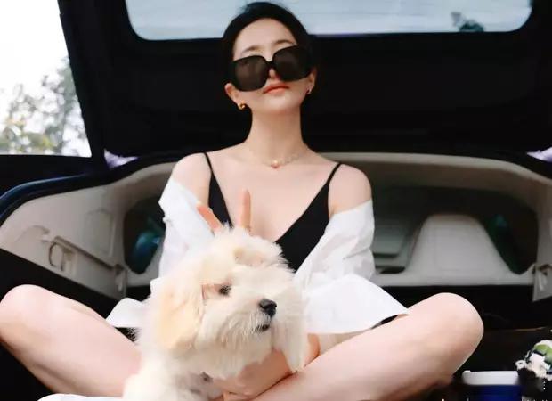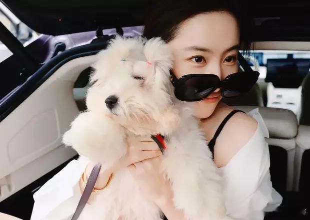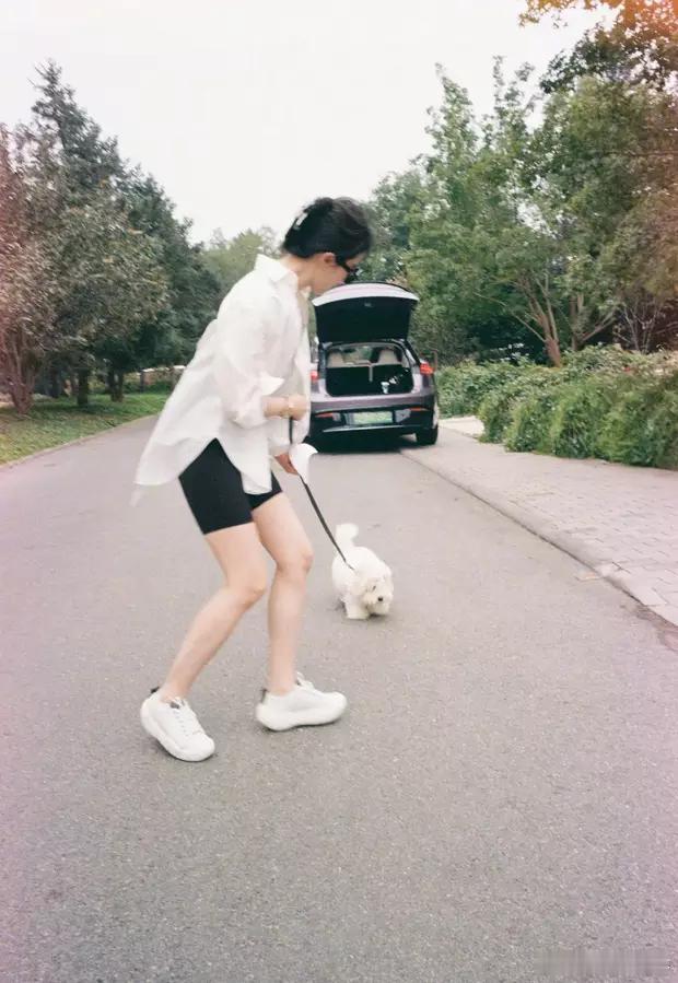 分享娱乐[超话]分享娱乐刘亦菲穿着黑色吊带短裤,搭配白色衬衣,抱着狗狗出门散步