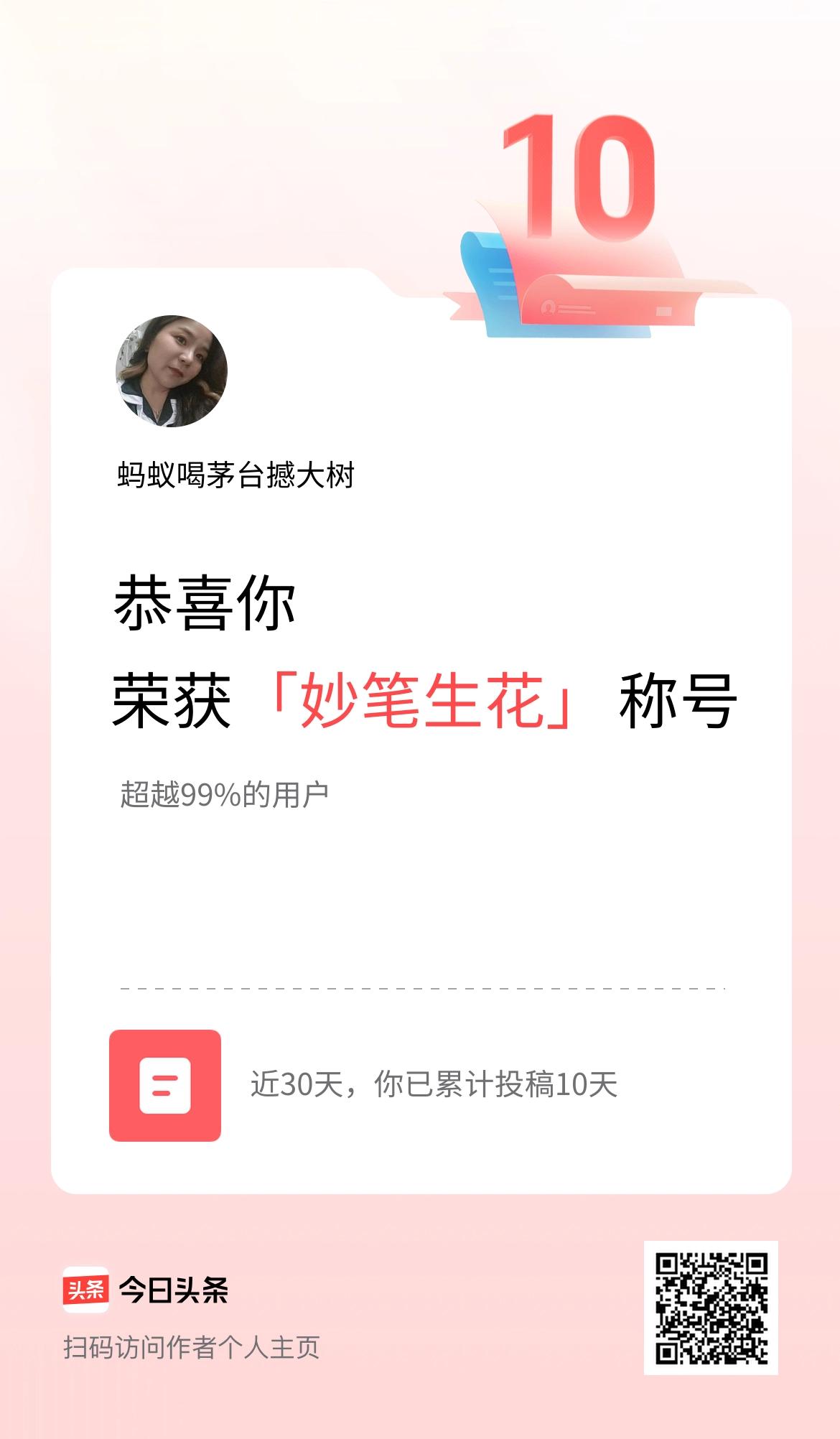 我在头条30天内投稿打卡10天,获得“妙笔生花”称号