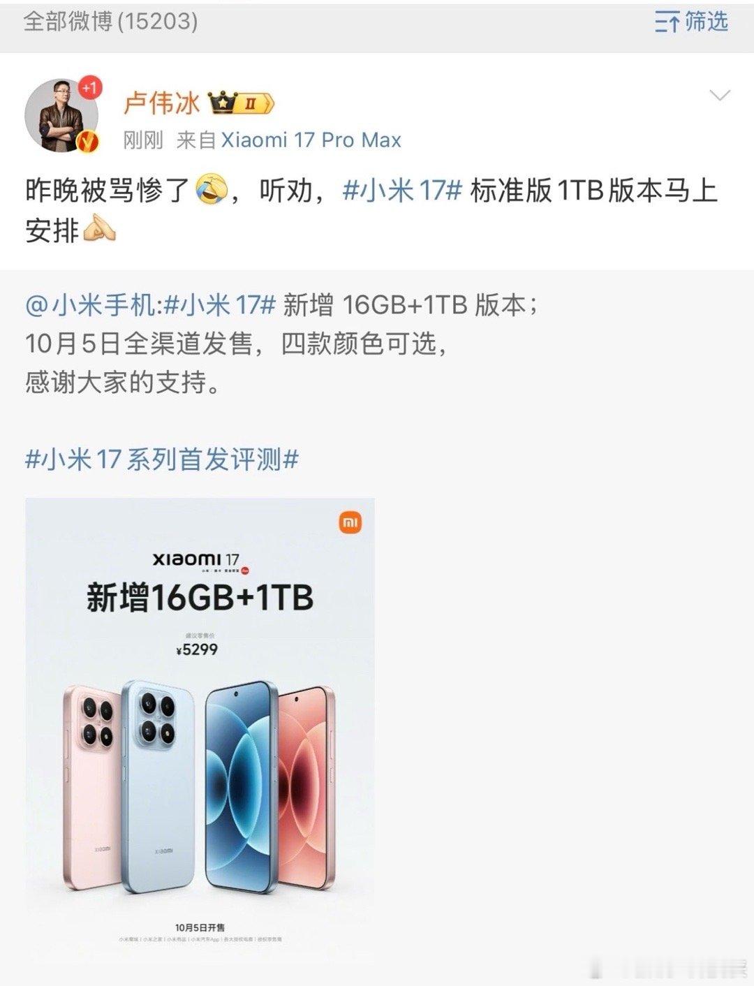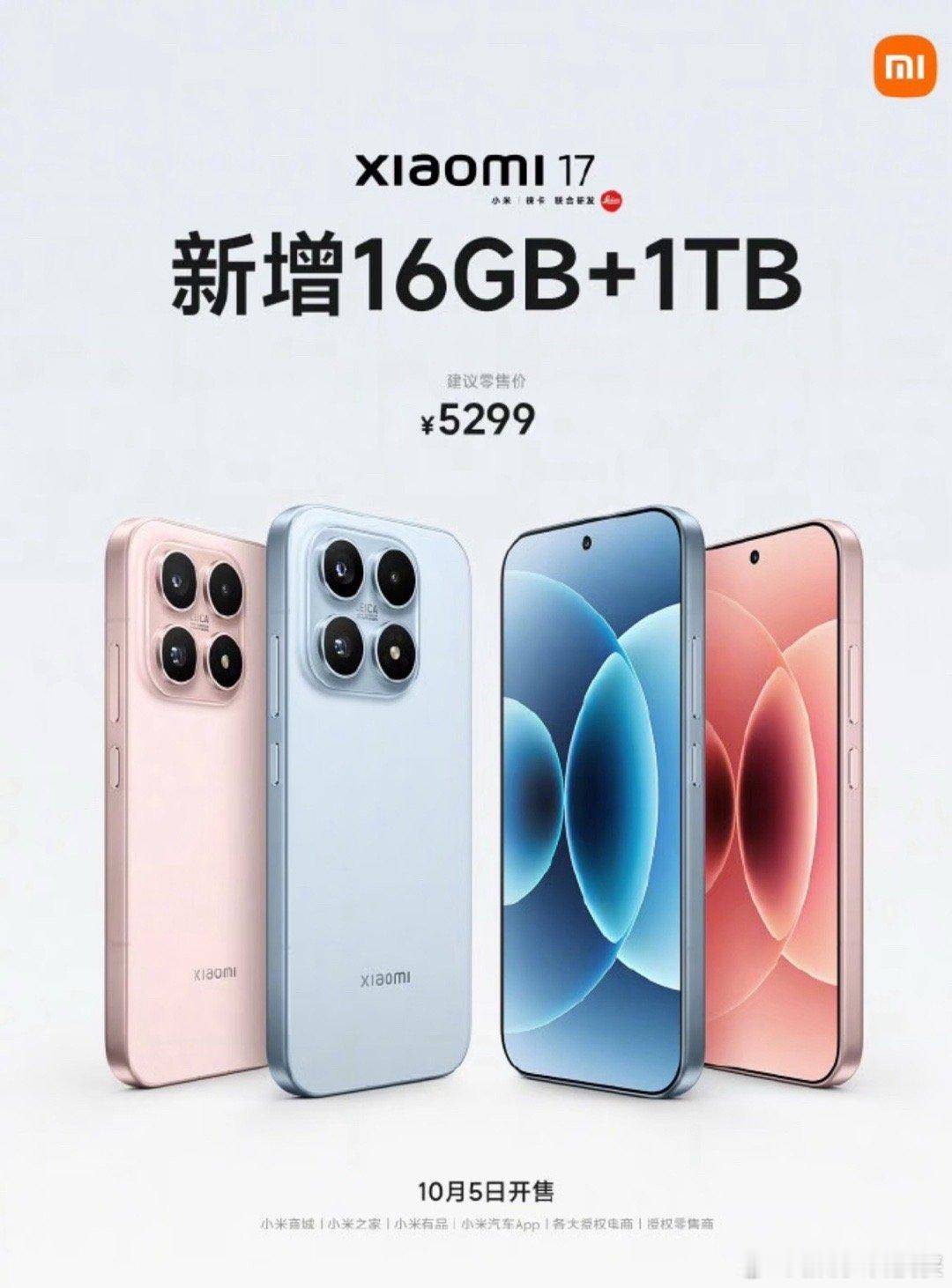 小米17开售1TB版小米的听劝是真上大分了哈哈,之前标准版没1TB被吐槽,立马安排上,10月5号就能交付,用户要啥给啥的态度就是很圈粉啊~