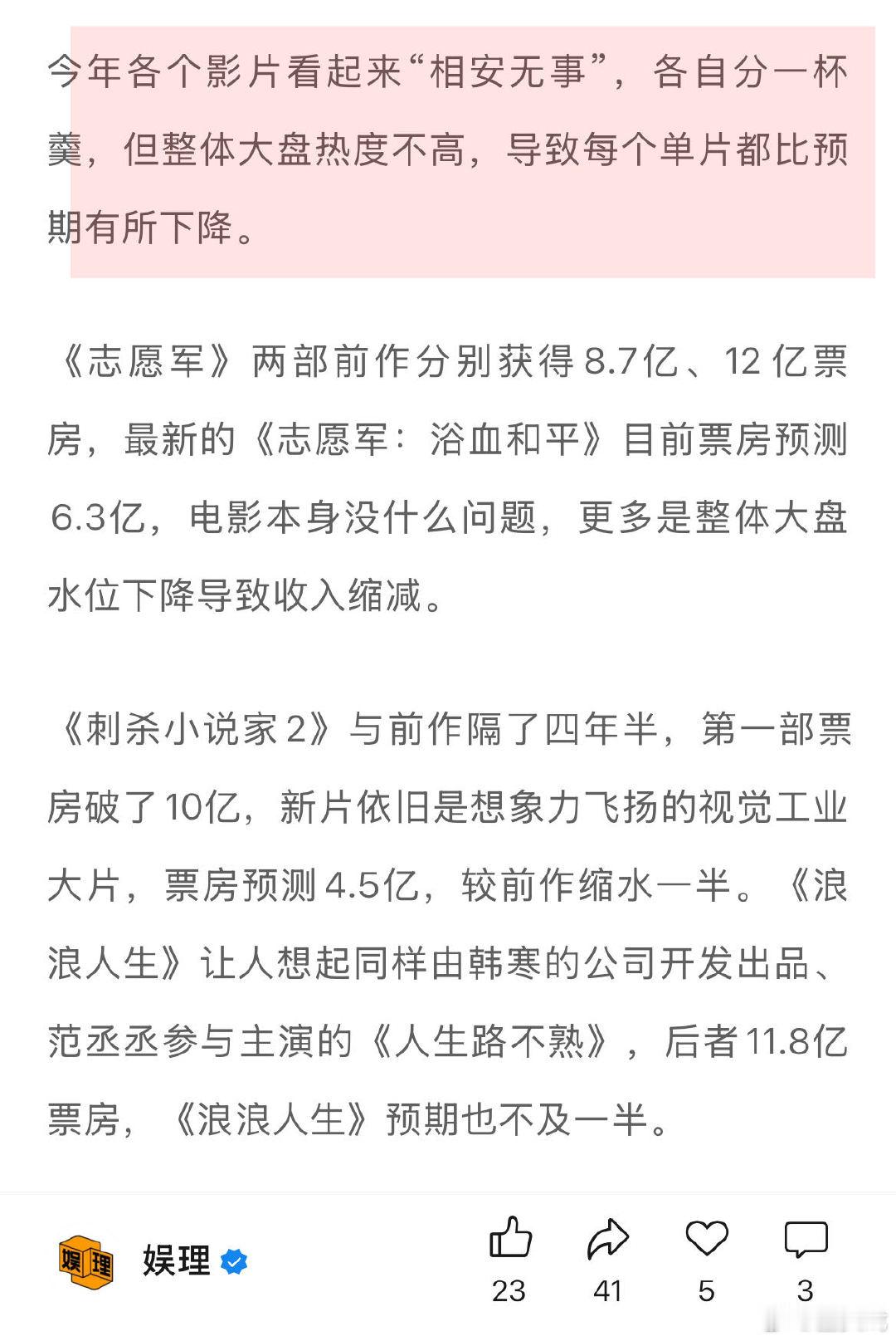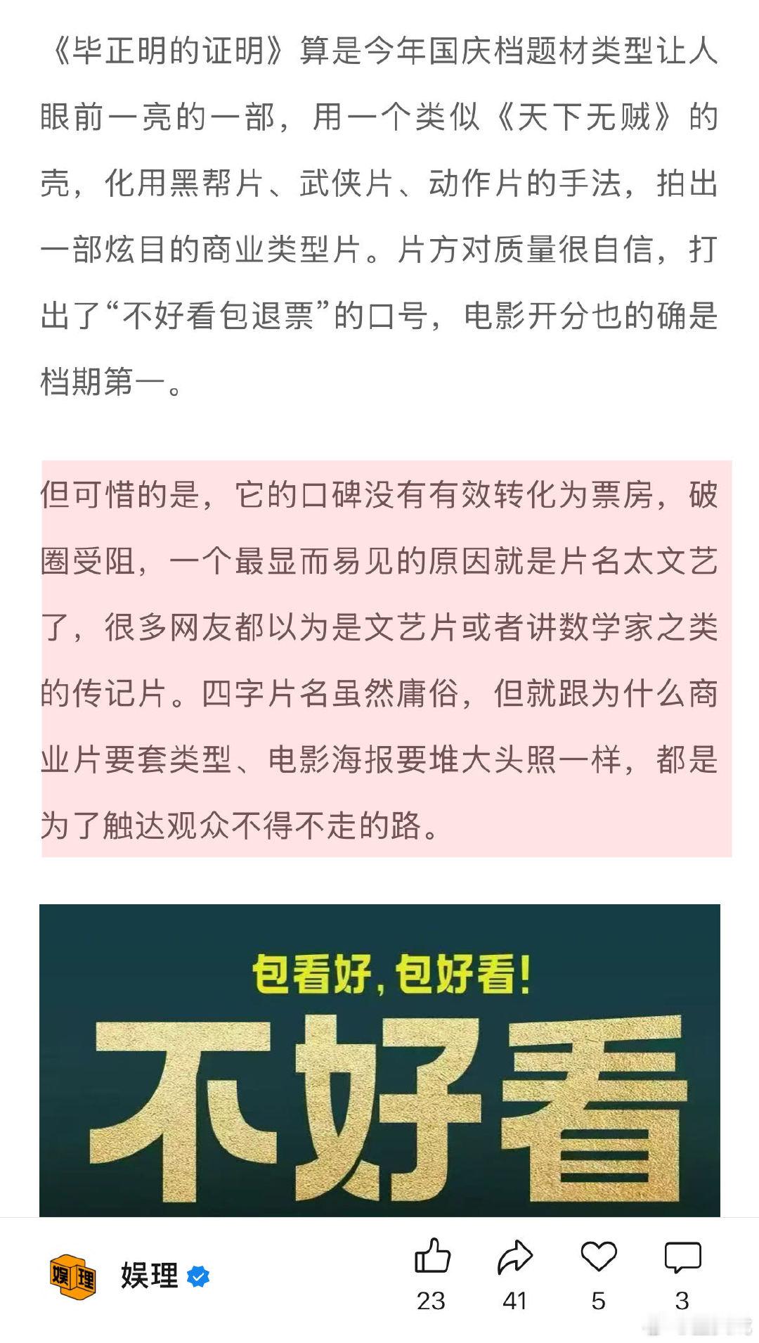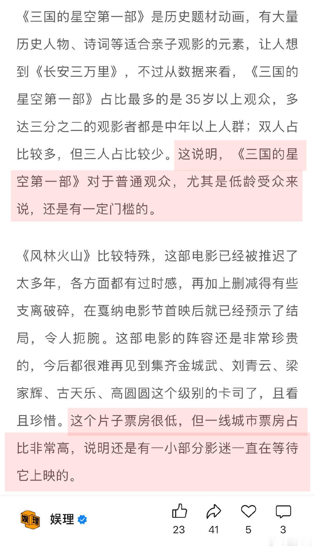 国庆档最大的新鲜感是新面孔 主旋律大片始终是国庆档的主流 《三国的星空》对普通观众(低龄受众)来说,有一定的门槛的。《风林火山》一线城市票房占比非常高,说明有一小部分影迷一直在等待它上映。《毕正明的证明》算是今年国庆档题材类型让人眼前一亮的一部,但破圈受阻,一个最显而易见的原因就是片名太文艺了…娱理独家↓