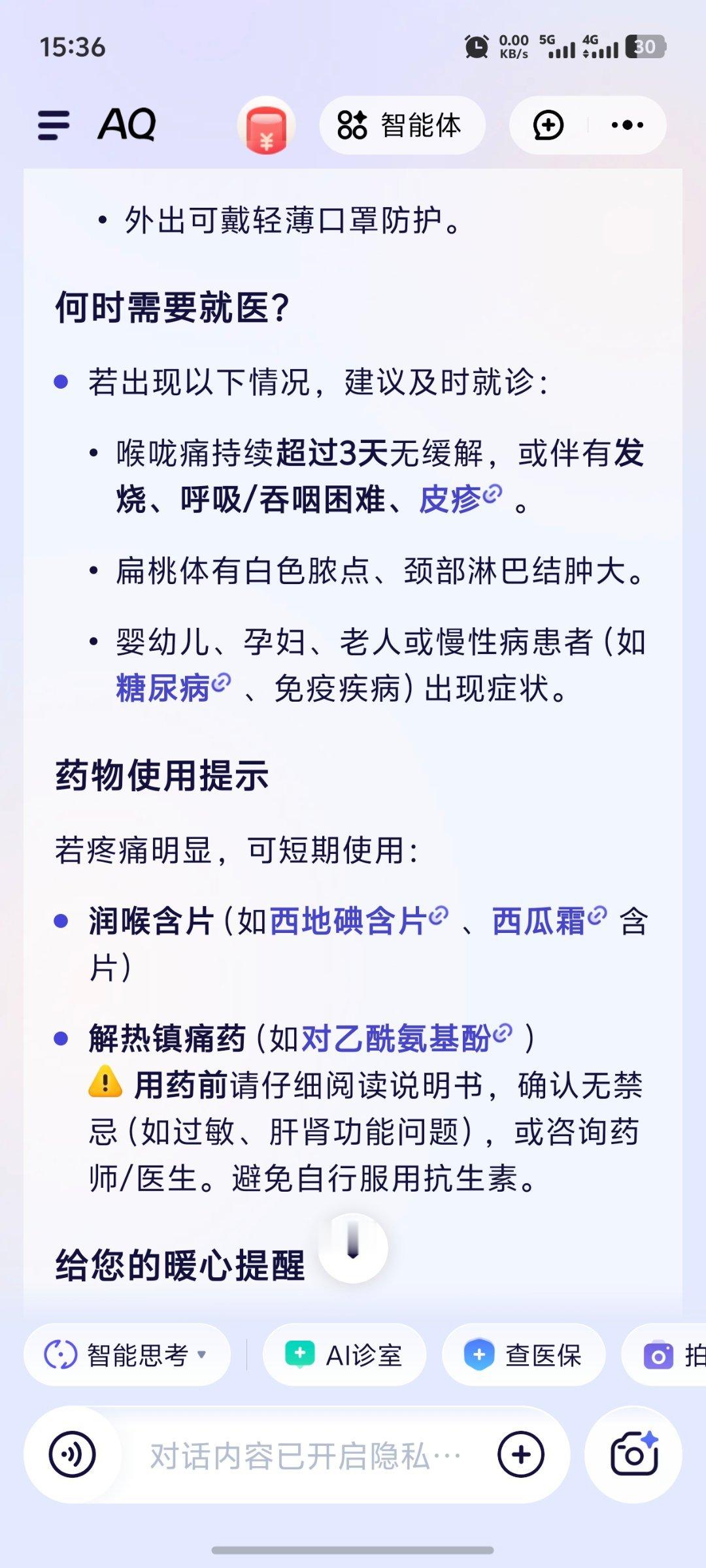 还好能用AQ的AI健康助手帮我分析,输入症状后,它不仅分析可能是水土不服加气候干燥导致的,还推荐了可以缓解的药。