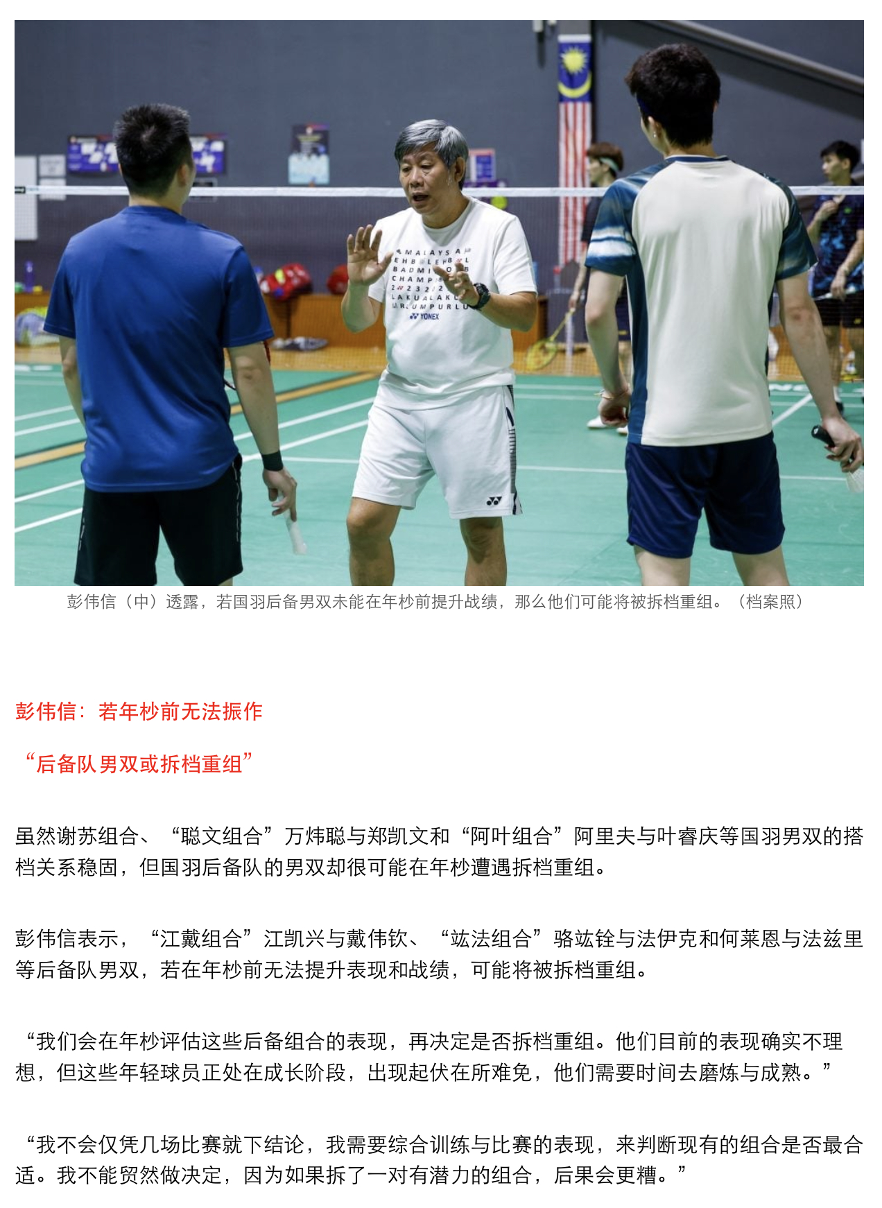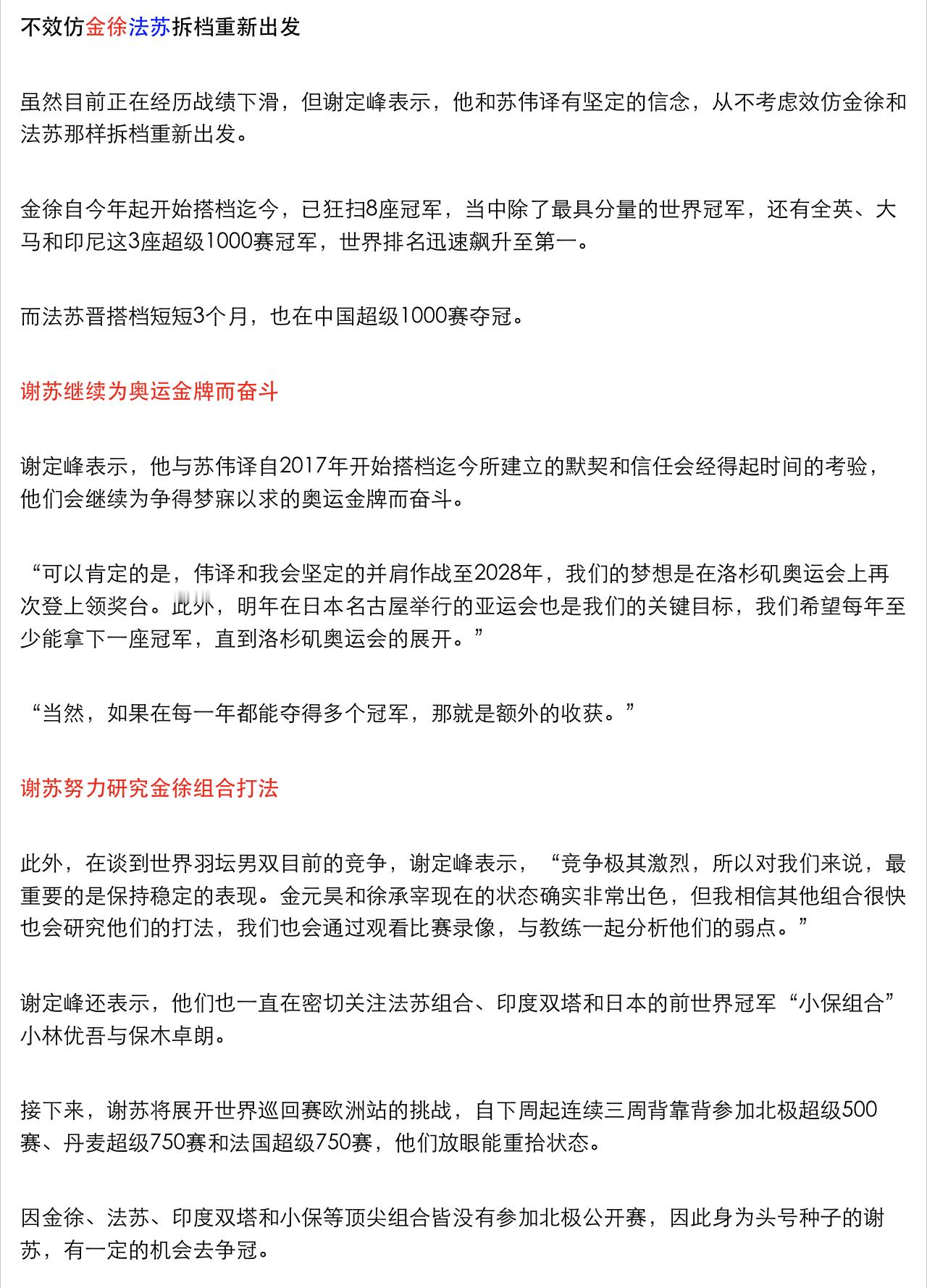 谢苏虽然目前正在经历战绩下滑,但谢定峰表示,他和苏伟译有坚定的信念,从不考虑效仿徐金和双菲那样拆档重新出发。