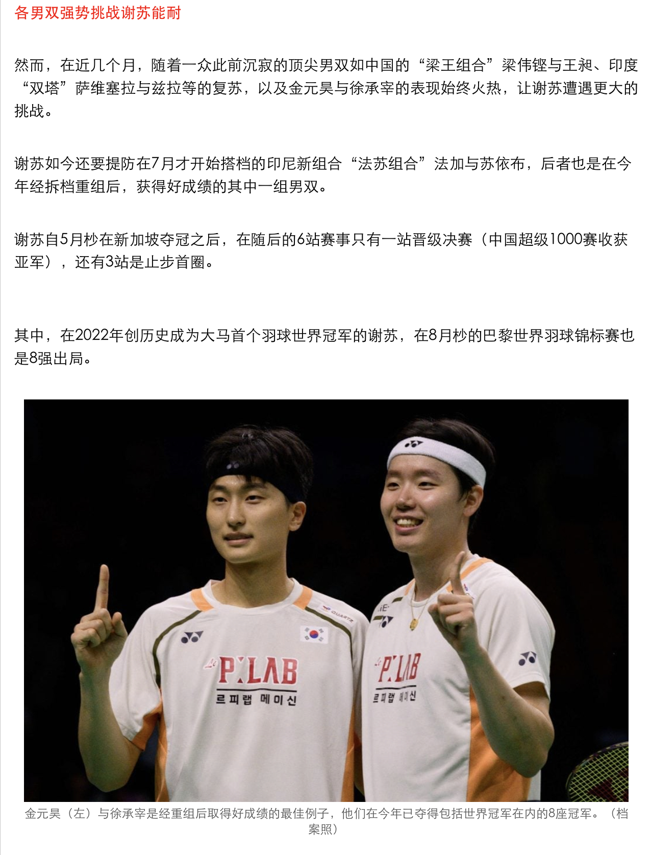 谢苏表示会努力研究徐金组合打法,谢定峰,“竞争极其激烈,所以对我们来说,最重要的是保持稳定的表现。金元昊和徐承宰现在的状态确实非常出色,但我相信其他组合很快也会研究他们的打法,我们也会通过观看比赛录像,与教练一起分析他们的弱点。”