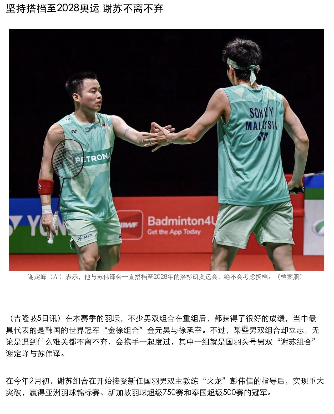 “可以肯定的是,伟译和我会坚定的并肩作战至2028年,我们的梦想是在洛杉矶奥运会上再次登上领奖台。此外,明年在日本名古屋举行的亚运会也是我们的关键目标,我们希望每年至少能拿下一座冠军,直到洛杉矶奥运会的展开。”“当然,如果在每一年都能夺得多个冠军,那就是额外的收获。”