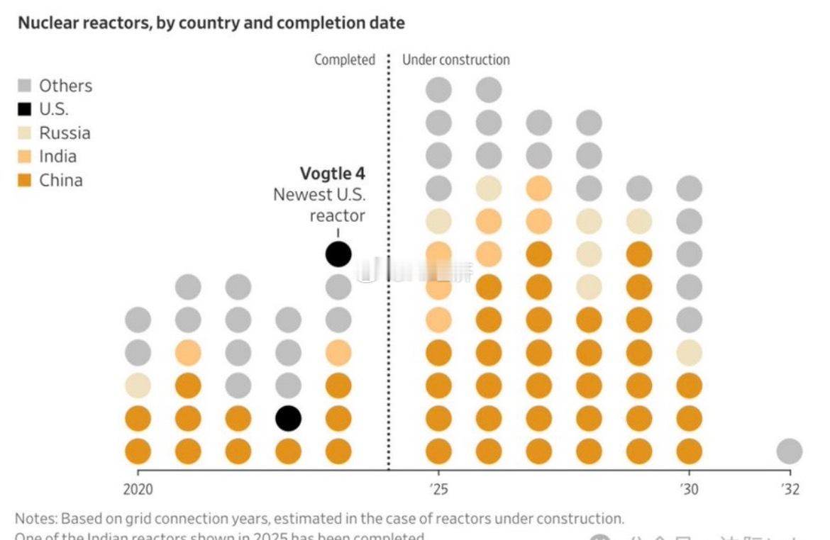 华尔街日报 华尔街日报:根据世界核能协会的数据,在全球核反应堆建设浪潮中,中国已占据主导地位,目前全球约一半的在建反应堆均位于中国,并在新反应堆设计方面处于领先。与此同时,俄罗斯则主导着反应堆的全球出口市场。相比之下,美国在近年仅完成一座新反应堆(Vogtle 4)后,其新反应堆建设已陷入停滞。