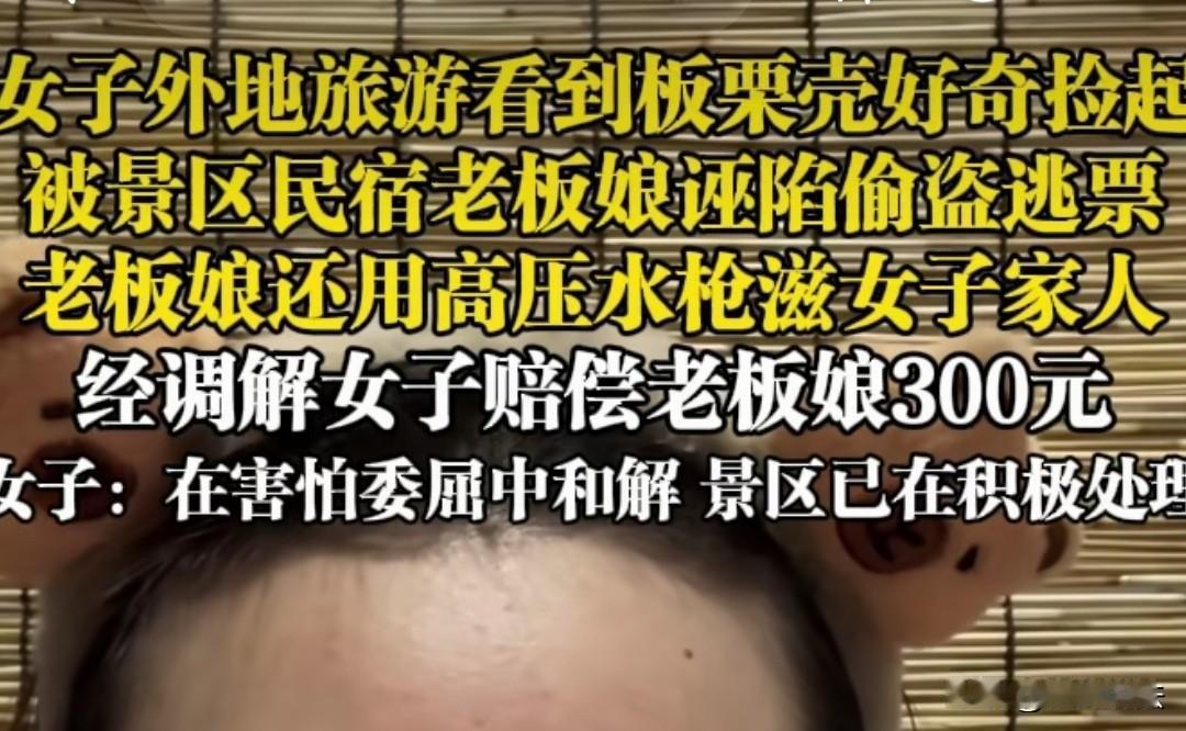 连云港,女子一家人在景区游玩,看见有掉落的板栗,因没有见过带壳的,出于好奇就捡起来看看,结果民宿老板娘冲出来,说女子他们是小偷,女子怎么解释都没用,最后老板娘还动手了,女子母亲推她手臂,老板娘顺势倒下,她说自己估计要流产了要求赔偿2000元,后来调解要赔偿300元。 女子觉得很委屈,认为他们不应该赔偿老板娘300元的营养费,她讲述了这一次经历。 趁着国庆假期,他们一家打算好好玩玩,于是在10月4日这天来到了连云港。 在连云港某个景区游玩时,路过一片板栗区,有板栗果实掉了下来,女子家人告诉她是板栗果实。 女子平时见到的都是剥壳的,带壳的板栗还真没有见过,她挺好奇的,于是就蹲下来想要把板栗捡起好好看看,到底是长什么样的。 她刚把板栗捡起,还来不及仔细看,民宿的老板娘冲了起来,一开口就说女子他们是小偷。 女子也听说过有游客偷摘东西的现象,虽然不多,可游客多了,每个人都摘一点,那就多了。 女子理解老板娘也这么认为,于是连忙向其解释,说他们只是好奇看一下,并不是要偷,而且他们也是逃票进来的。 可老板娘根本不听他们的解释,说他们就是小偷,就是逃票,还说要报警抓他们。 双方争执了起来,女子的母亲就拿出手机录视频,老板娘看见了,拿起高压枪就往女子母亲和外婆脸上喷。 老板娘的行为让女子他们很生气,特别是向着女子外婆这么做,女子母亲不干了,上前推开她的手臂,结果她顺势就倒下去。 女子他们愣了一下,都不清楚是怎么一回事,老板娘在景区上班的父亲来了,开始录视频,说女子他们这么多人是怎么欺负她女儿的,还打电话叫景区工作人员来查票。 因为老板娘这一倒下,双方发生了争吵,期间老板娘不服,用手肘攻击女子的弟弟。 当时双方斗比较激动,女子弟弟被攻击,当然要回推老板娘,结果这一摔,老板娘就说她怀孕两个月了,现在见红了,要流产了,要求女子他们赔偿2000元。 女子他们觉得很无辜,事情是老板娘挑起的,也是她先动手,他们只是自卫。 而且老板娘明知道自己怀孕,她为什么还要动手,一般人都不会这么做。 女子他们都不同意赔偿2000元的要求,后来经过调解,老板娘他们要求300元的营养费。 女子觉得他们是外地的,人生地不熟的,也有点害怕,虽然不情愿,但还是拿出了300元给老板娘。 300元虽然不是很多,可女子觉得这钱就不应该赔偿,当时出于害怕,只能吃下哑巴亏给钱了,女子越想越觉得委屈,于是讲述自己都要经历,让大家评评理。 1、老板娘说自己流产了,要求女子他们赔偿2000元,是否合理? 《民法典》第一千一百六十五条规定:行为人因过错侵害他人民事权益造成损害的,应当承担侵权责任。 依照法律规定推定行为人有过错,其不能证明自己没有过错的,应当承担侵权责任。 老板娘在没有核实女子是否偷板栗的情况下,就说他们是小偷,女子他们解释她也不听,还先动手,明知自己是个孕妇还这么做的,导致其摔倒流产,其本身是存在过错的。 如果再这场争执中,女子他们只是出于自卫,他们是没有过错的,不应该承担侵权责任。 2、老板娘先动手,女子他们后来才出手,后来老板娘摔倒,她说她流产了,起初要求2000元赔偿,后来调解只要300元,这似乎不符合常理,老板娘很有可能存在敲诈勒索行为。 《治安管理处罚法》第四十九条规定:盗窃、诈骗、哄抢、抢夺、敲诈勒索或者故意损毁公私财物的,处五日以上十日以下拘留,可以并处五百元以下罚款;情节较重的,处十日以上十五日以下拘留,可以并处一千元以下罚款。 如果老板娘根本就没有怀孕或者没有所谓的流产预兆,她就存在敲诈勒索的可能,是要承担法律责任的。 出门在外旅游,千万不要因为好奇而去拿或者摘什么东西,你以为的正常行为,很有可能会变成是盗窃行为。 对于此事,您怎么看?