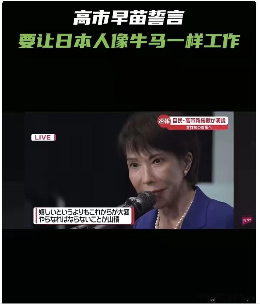 当地时间10月4日下午,日本前经济安全保障担当大臣高市早苗当选日本自民党新任总裁。 高市早苗表示:“大家要像牛马一样努力工作……我自己也会工作,工作,再工作!”。 尘埃落定,口风也变了。 就是这个高市早苗,胜选之前,一再挑起事端,提高关注度为自己加分。她叫嚣“台湾有事就是日本有事”,扬言要带领日本“夺回”钓鱼岛、打进渤海湾;她高调宣布“控制”独岛和北方四岛。日本周边国家中俄韩三国都成了她炫耀强硬的素材。 高市早苗的伎俩和玩法见效了:她如愿以偿当上了自民党总裁。那帮阴魂不散的日本右翼分子还真的指望她能兑现竞选时承诺的政治主张?那是一部分偏执狂的白日梦。 倒是中国网友有点遗憾,想看看高市早苗是否真的能给中国一个彻底清算中日之间历史遗留问题的机会。 然而,她的口风变了,不再对外强硬,而是忽悠日本国民:“大家要像牛马一样努力工作…。这就是典型的不良政客的嘴脸。