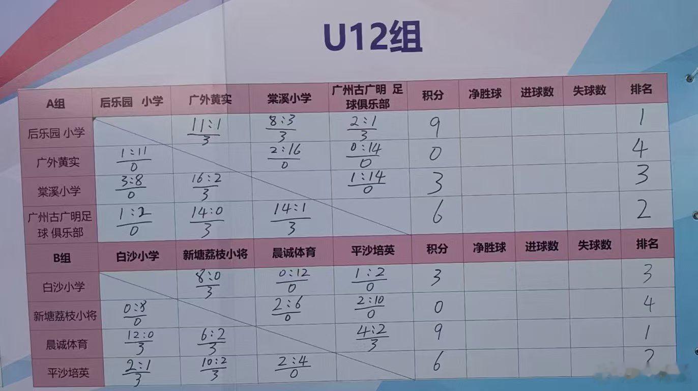 U12金盾组对阵:三、四名:新塘荔枝小将vs广外黄实,一、二名:棠溪小学vs白沙小学;U12金杯组对阵:三、四名:后乐园小学vs晨诚体育,一、二名:平沙培英vs广州古广明俱乐部。希望各支球队做好决赛的准备,争夺最后的荣誉!
