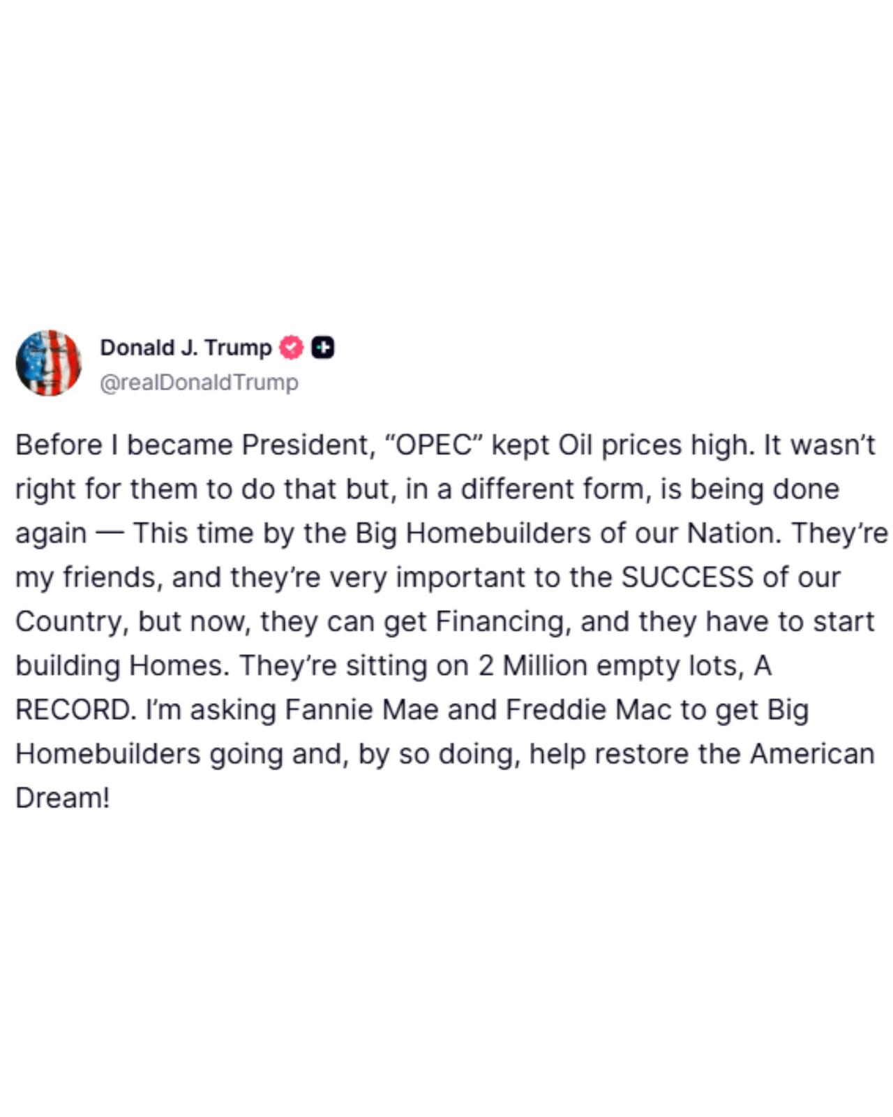 🚨突发新闻:特朗普总统要求比尔·普尔特领导的房利美和房地美“立即行动”,让建筑商建造数十万套房屋,以重建美国梦 他们坐拥200万块空地,创下纪录。我呼吁房利美和房地美启动大型房屋建筑商,以此帮助重建美国梦! 🚨 BREAKING: President Trump asks Fannie Mae and Freddie Mac, led by Bill Pulte, to "GET GOING" on having builders construct hundreds of THOUSANDS of homes to restore the American dream "They’re sitting on 2 Million empty lots, A RECORD. I’m asking Fannie Mae and Freddie Mac to get Big Homebuilders going and, by so doing, help restore the American Dream!"