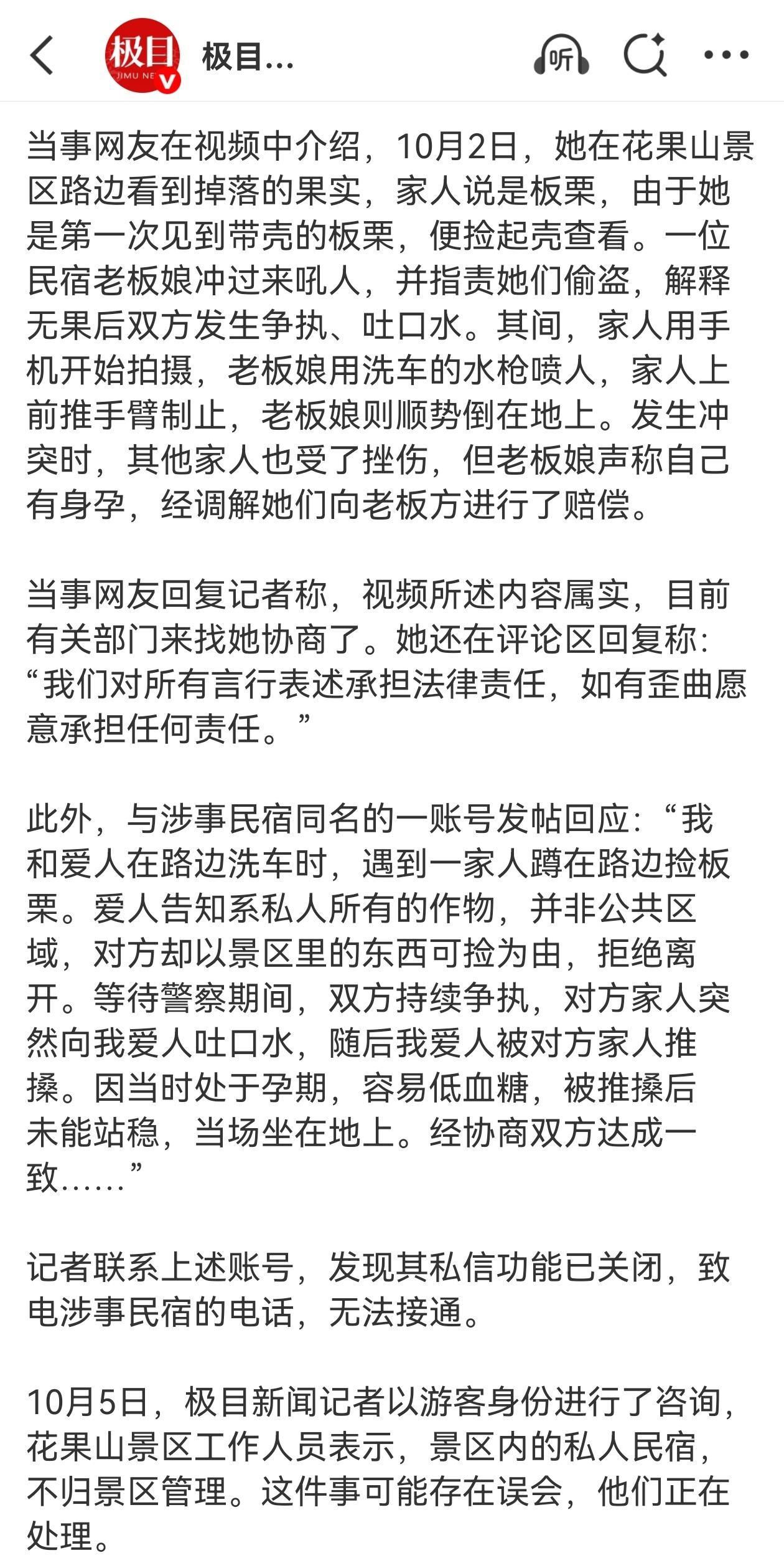 看了一下媒体报道,事件双方各有说辞,到底孰是孰非,还是得等等看了。 眼下我们这边也正是收获栗子的时节,每年这时候当地农户与外来捡栗子的人也是时常产生矛盾。 就我们当地来说,卖栗子的钱是比较重要的一笔家庭收入。但是年年都有人跑来“捡”栗子,还振振有词的说是野生的。农户对此是深恶痛绝的! 这到底是不是民宿老板娘家的栗子树,是否像他们说的有劝阻但是游客拒绝离开?游客是否仅仅只是出于好奇捡了栗子……? 虽然看到这事的一些视频,但是毕竟没法完整了解事情经过,所以说还是得等等看警方的调查结果。