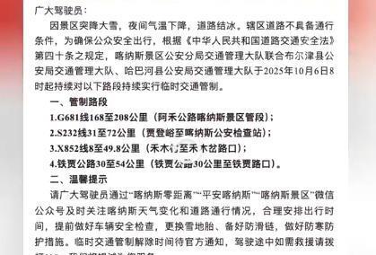游客因大雪被困阿勒泰超10小时,阿勒泰大雪被困游客发声 10月5日晚间至6日凌晨,多名游客发帖称,他们自驾从禾木出发前往布尔津,行至距禾木约30公里路段时,因道路结冰、车辆打滑引发拥堵,被困时间超10小时。据一位游客反映,被困路段室外温度降至零下,持续降雪导致多人多车无法移动,她的车辆燃油将尽,食物和饮用水面临短缺,随后通过社交平台发帖求助。现场另有游客补充,拥堵源于一处上坡路段结冰,多辆车辆打滑难以通行,导致后方车辆全部被阻断。 10月6日上午,一位发帖者告诉@扬子晚报 记者,她10月5日下午两点左右从禾木村出发前往布尔津,出发后不久道路就开始拥堵,直到6日中午一直堵在三岔路口附近盘山道上。该发帖者称,6日凌晨曾有官方救援人员给了他们两箱方便面,他们自己带的食物基本吃完了。 10月6日上午,平安喀纳斯发布通报称,因景区突降大雪、夜间气温下降致道路结冰,辖区道路不具备通行条件,自10月6日8时起,对G681线168至208公里(阿禾公路喀纳斯景区管段)、S232线31至72公里(贾登峪至喀纳斯公安检查站)、X852线8至49.8公里(禾木村至禾木岔路口)、铁贾公路30至54公里(铁贾公路30公里至铁贾路口)等路段持续实行临时交通管制。临时交通管制解除时间待官方通知,驾驶途中如需救援请拨打110。 6日中午,记者多次拨打布尔津县交警大队电话,但一直未能接通。6日中午,记者从布尔津县应急管理局获悉,相关道路仍处于临时管制状态,应急管理局相关领导已赶赴现场参与救援,当地文旅局、应急管理局等多部门同步开展对被困游客的救援工作。同时应急管理局工作人员提醒广大游客,可通过“平安喀纳斯”等官方公众号及时关注最新情况通报。(见习记者 马斌 剪辑 庆苗苗)