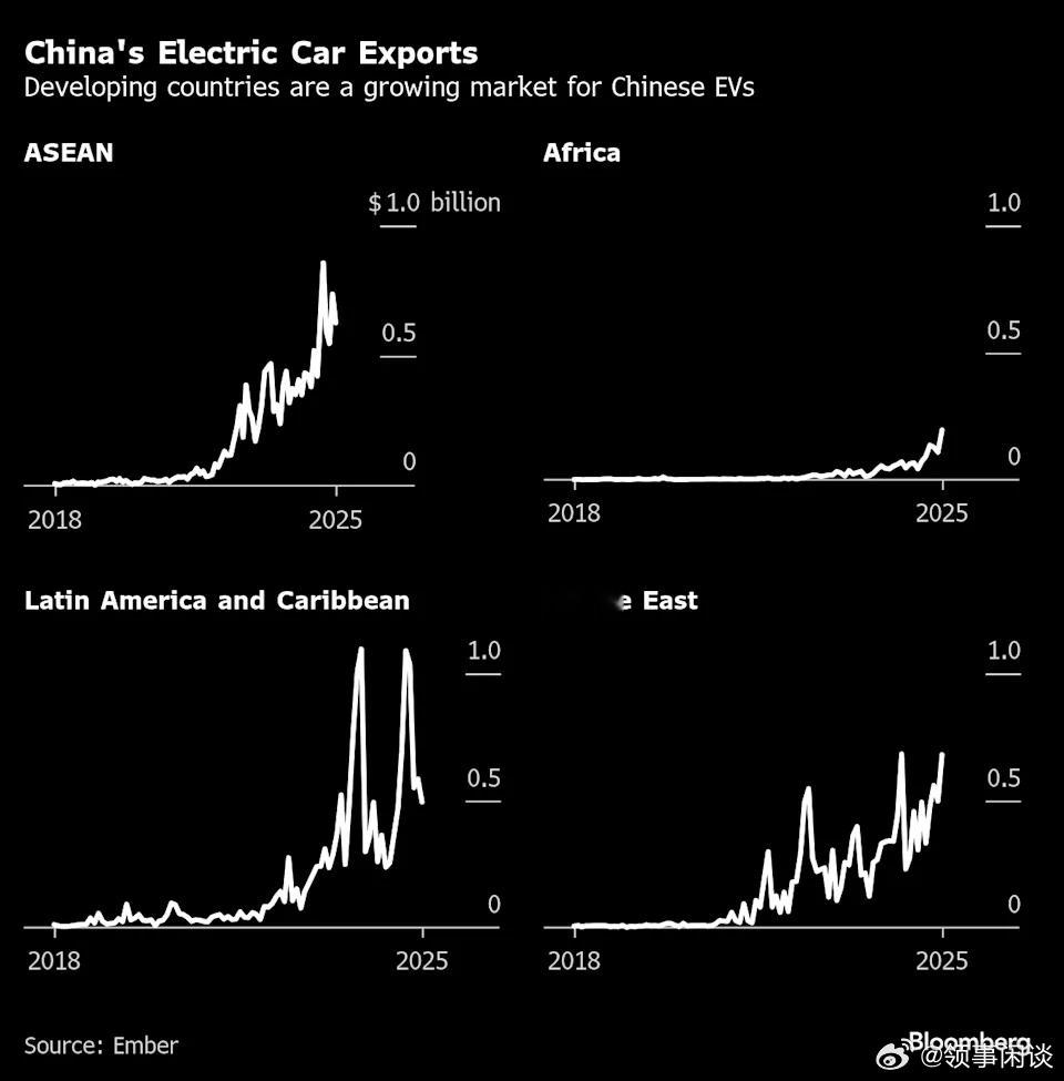至关重要的是,中国对新兴市场的出口正在快速增长。今年,中国超过一半的电动汽车出口来自经济合作与发展组织(OECD)以外的富裕国家。