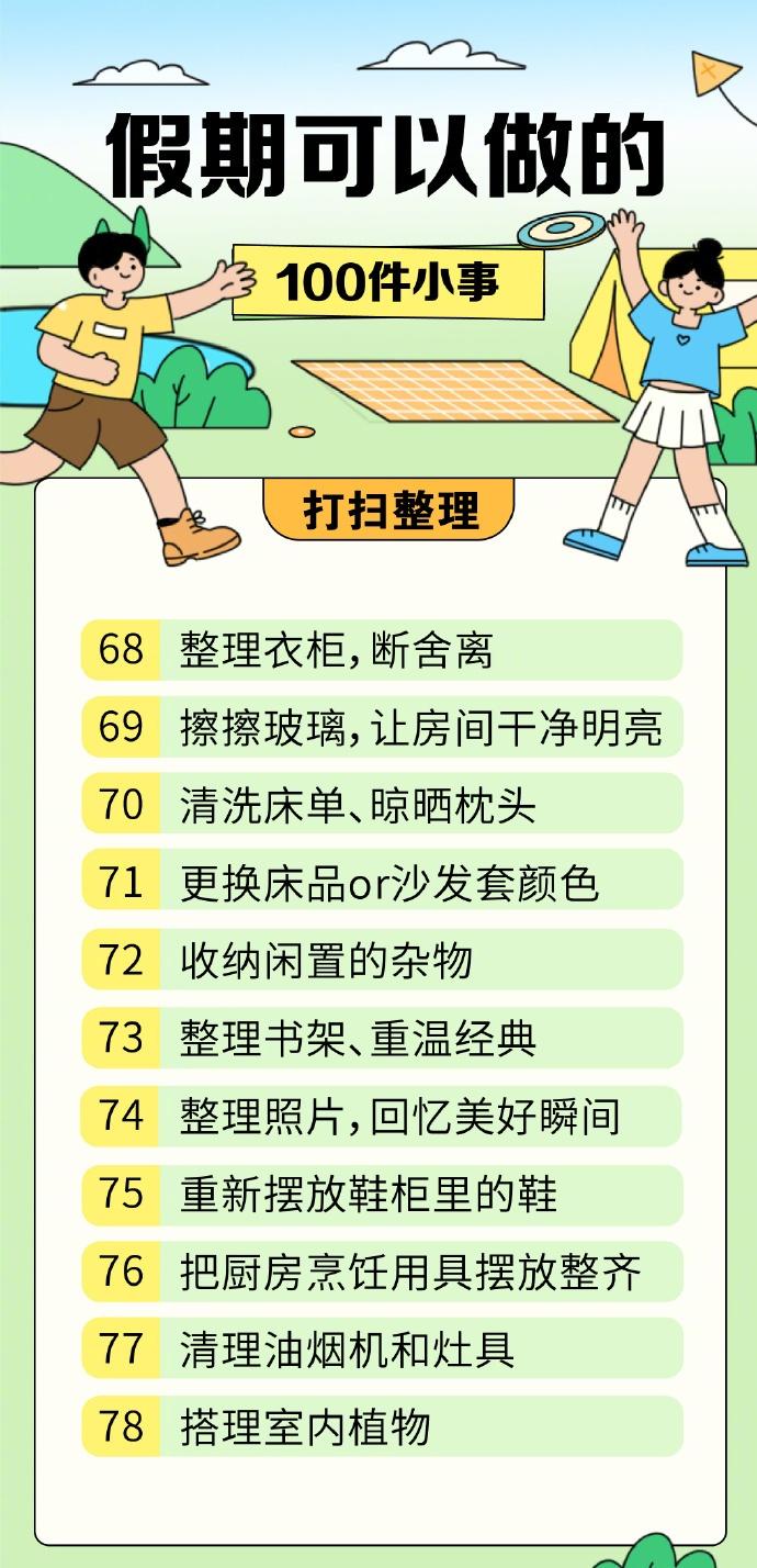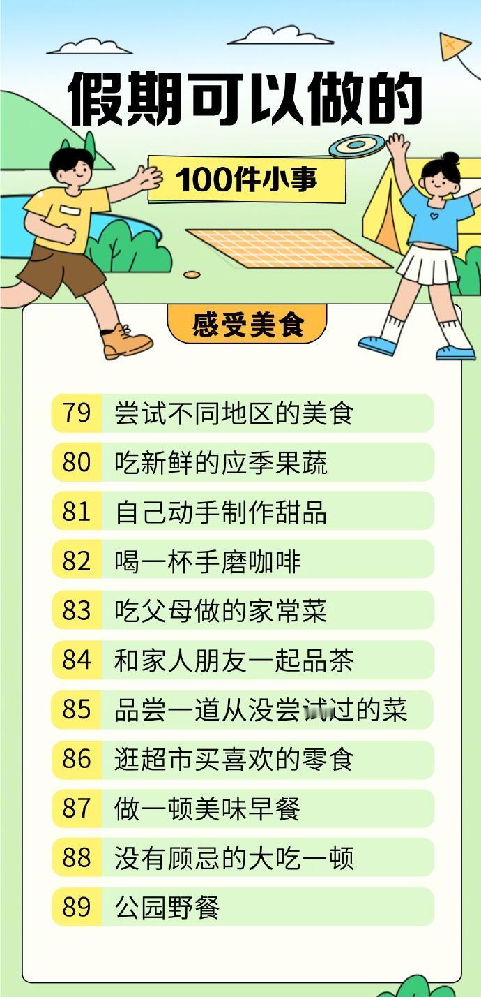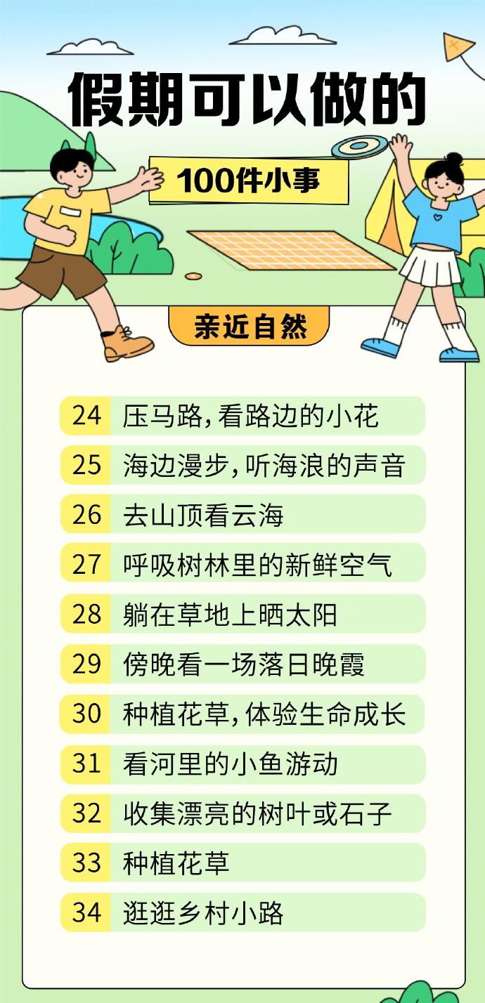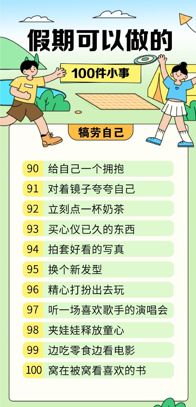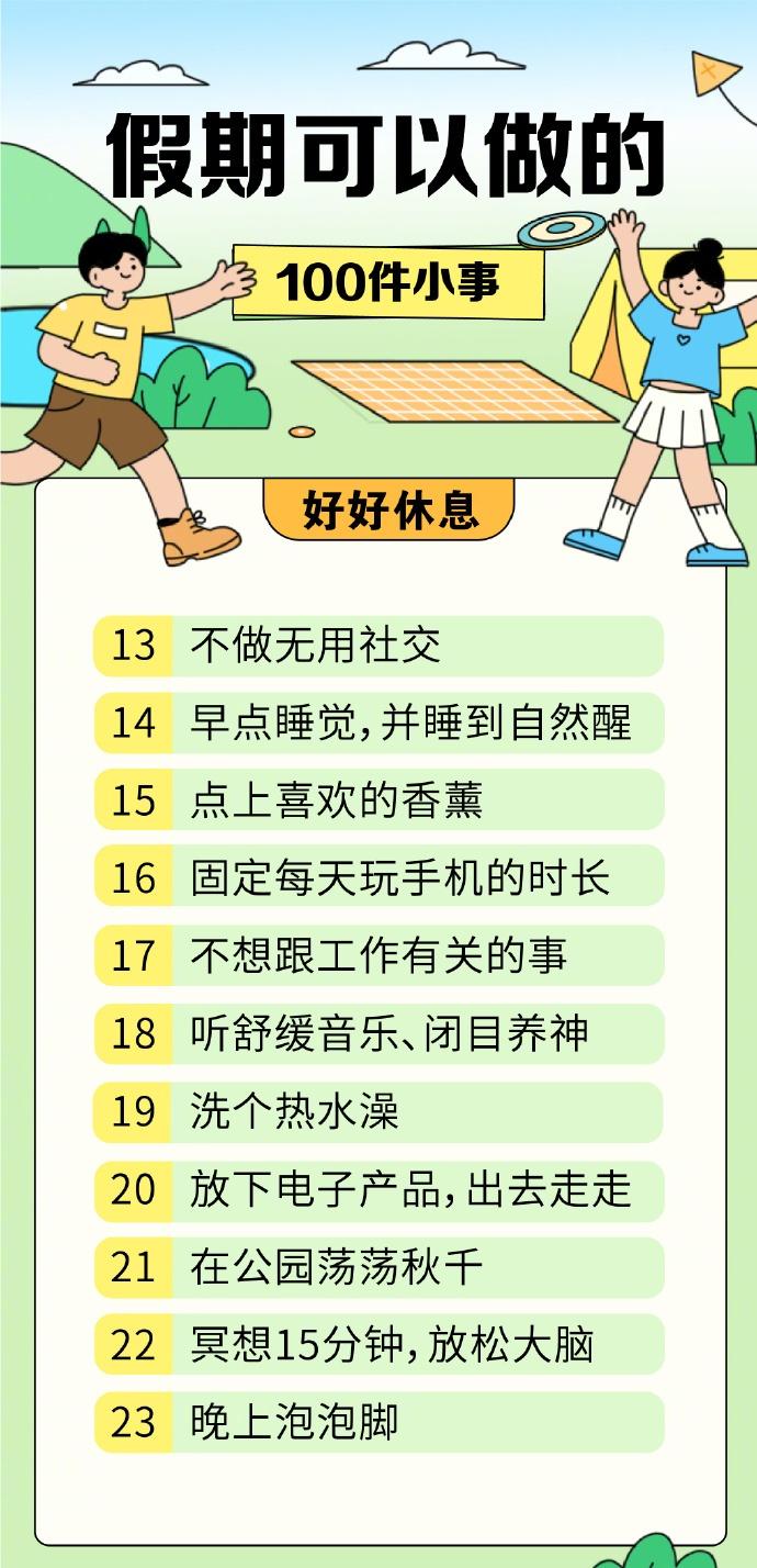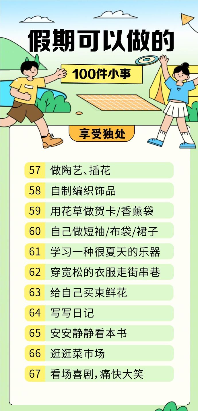 【100件适合假期的小事清单】100件让人快速恢复能量的小事 休息的本质是获得能量,平时为了工作、学习绞尽脑汁,精神时刻紧绷着。假期不妨选择简单的方式放松一下,为自己蓄力充电。这里有一份关于“快乐”的清单,让你在生活里感受那些简单的美好↓↓