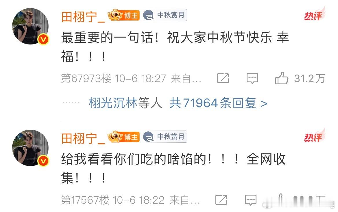 田栩宁中秋营业博,四个多小时都快1100w赞了…内赞30多万…