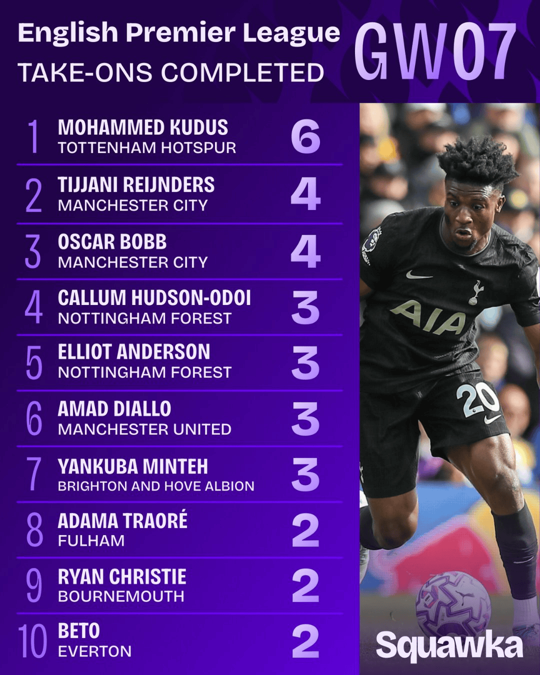 虎扑10月06日讯数据网站squawka统计了本轮英超的相关数据。在过人榜上,热刺攻击手库杜斯位列榜首。