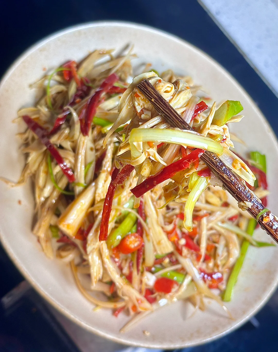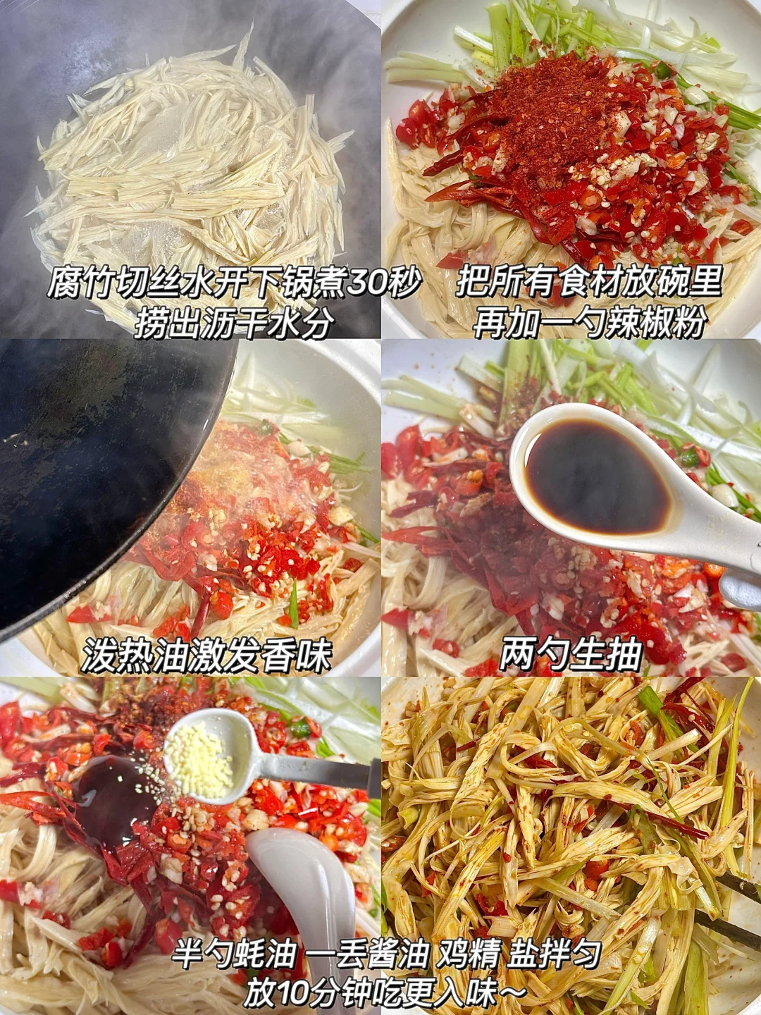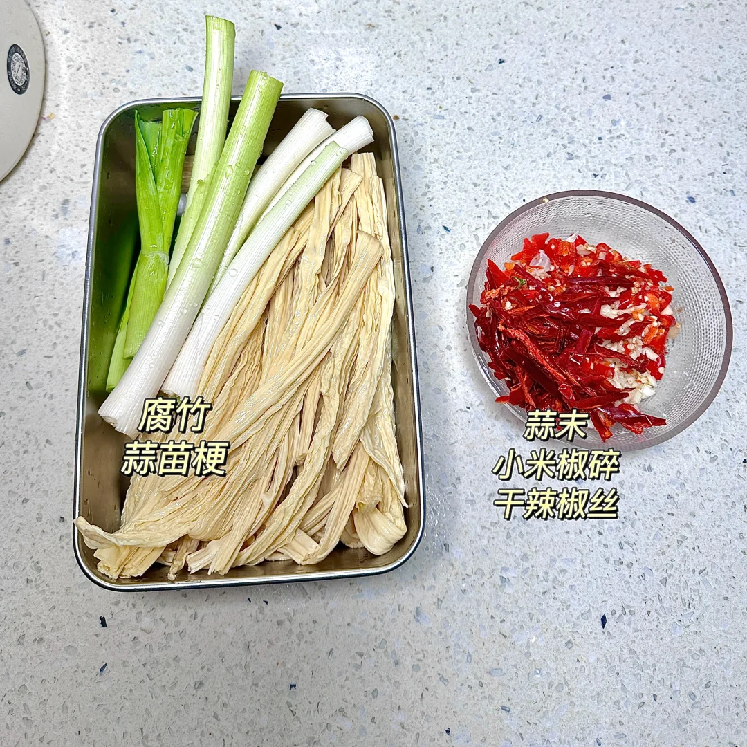 超入味 清爽解腻 真的巨巨巨好吃今天晚餐长这样 ✨食材:腐竹 蒜苗梗 蒜末 小米椒碎 干辣椒 1️⃣:腐竹提前泡发,温水里加一勺盐用碗盖住充分泡发(我晚上睡前泡的) 锅里水烧开,泡发好的腐竹斜刀切丝 放锅里煮到水再次烧开捞出沥干水分。(水分不控干不入味) 2️⃣:蒜苗梗对半切开再成切丝。所有食材放碗里,再加一勺辣椒粉泼热油激发香味,加两勺生抽 半勺蚝油 一丢丢酱油 鸡精 盐拌匀。拌好后尝尝 味道不够按照自己口味再调。 不吃蒜苗的可以不放蒜苗 一样好吃[哇R] 好好吃饭呀🖖🏻
