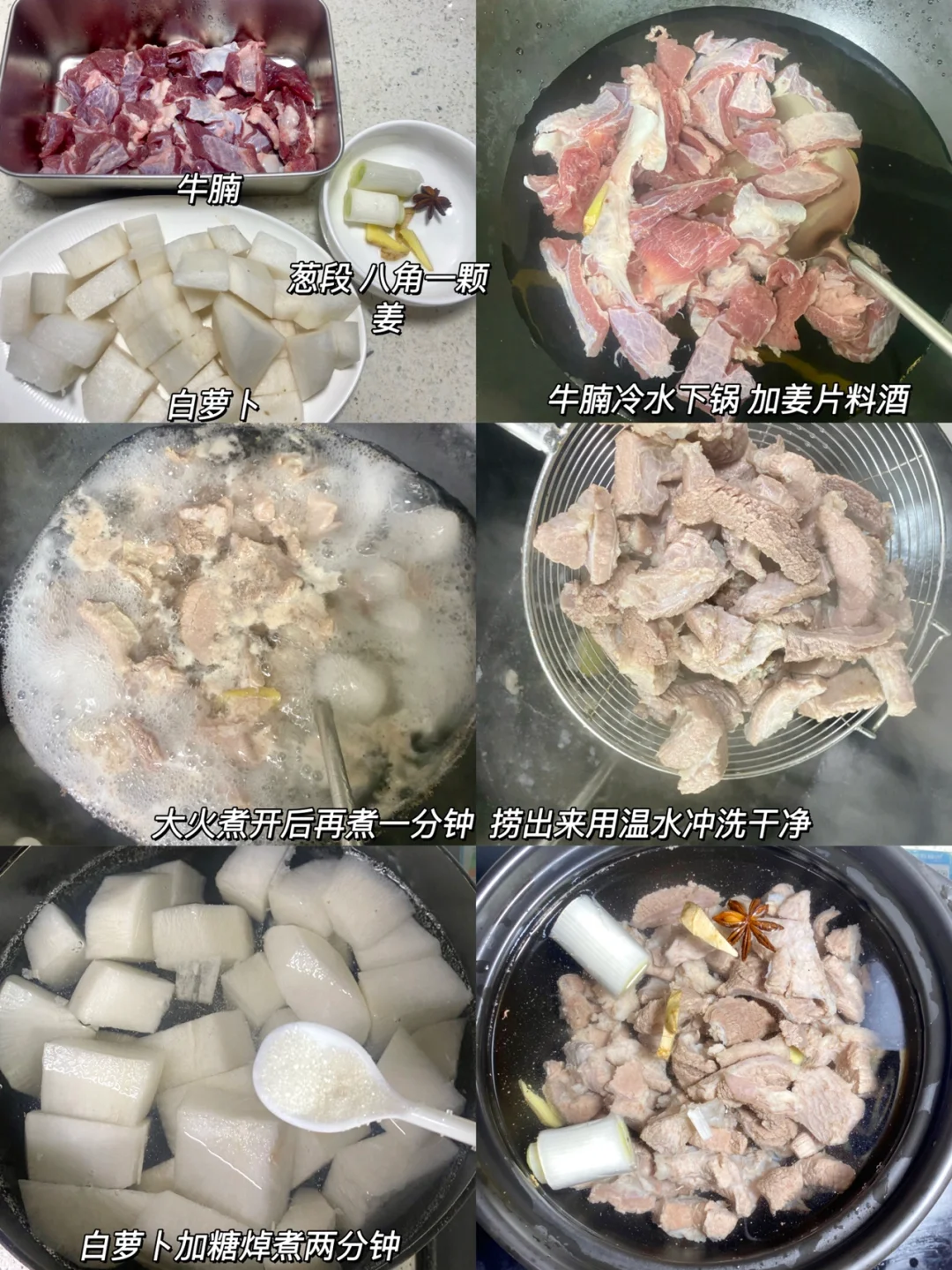 1⃣️:牛腩冷水下锅加姜片料酒焯水,烧开后再煮一分钟捞出用温水清洗干净。萝卜削皮 削两层切块,放锅里加一小勺白糖焯煮两分钟。