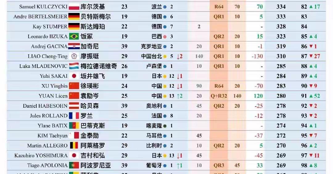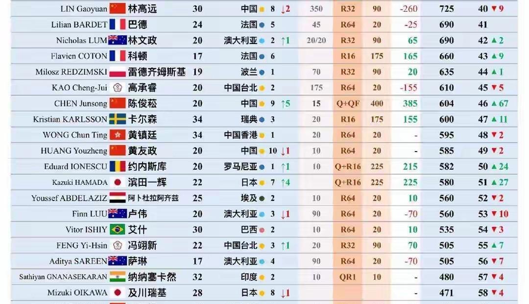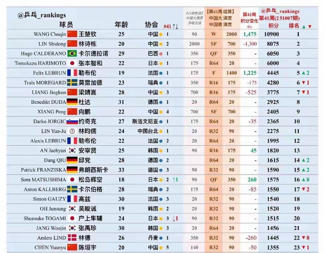 今天周二,10月7日,男队最新更新排名来了! 王楚钦称为称为南线历史上第一位积分过万的选手。 稳居排名第一,北京大满贯男单冠军加2000减去去年到期,增加了1475分。积分10900分。 林诗栋第二,加700减2000,减少1300分,保持第二。 最可惜的林高远,排名已经降到40名了!估计以后国际大赛上看不到他的身影了! 可喜的是陈陈俊松,单打到了8强,排名从103名,提升了67名,现在世排46名。 已经超过了黄友政, 薛飞排名第60名,徐瑛彬第90,袁励岑第91。 小勒布伦第5,打到了4强,提升了两个名次。 松岛辉空提升了8个名次,林德降了8个名次。