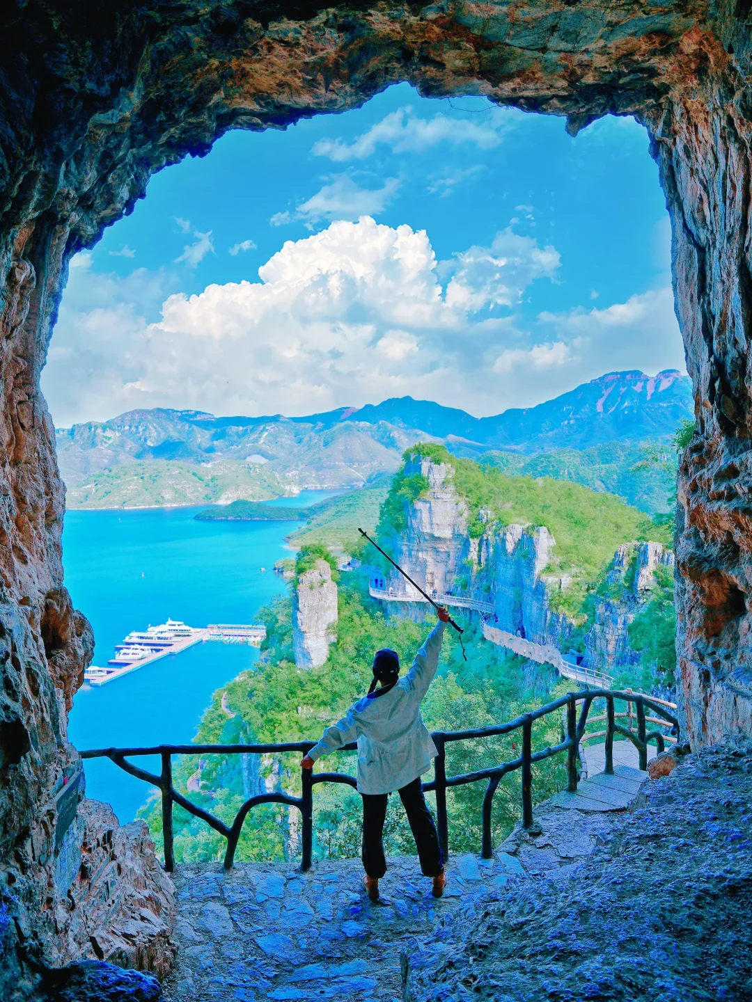 ①需要先乘船再爬山,依水而建的盘山栈道,山石林立,一步一景;