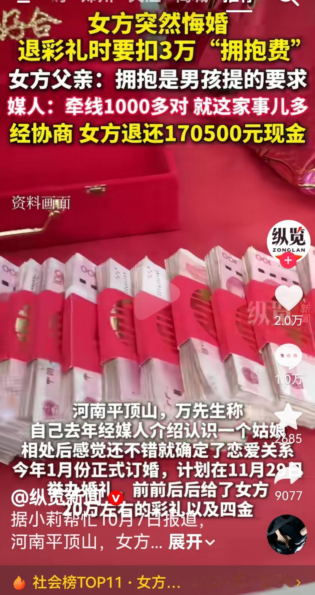 “拥抱费3万”,经过媒人介绍定亲了但是又不结婚了要从彩礼中扣除拥抱费3万 真是世界之大无奇不有 根据媒体报道,河南省平顶山市,万先生说经过媒人介绍认识了一个姑娘,感觉还不错于是就确定了恋爱关系,今年1月份订了婚,今年11月29日决定结婚,这其中也给了女方买了四金,20万左右彩礼钱,婚纱照也拍了,亲朋好友也通知了,婚宴酒店也确定了,但是女方突然那说不结婚了,说小伙太老实了,工资低,商量退彩礼时要扣除男孩拥抱女孩3万的拥抱费用 女孩子也说没有和男孩有矛盾,就是不想和他结婚了,女孩父亲说拥抱是男孩提出的必须扣除3万拥抱费 目前经过双方协商一致认为退换男方170500元 小伙啊,小伙你有3万块钱什么样女孩抱不了啊,女孩父亲倒是怪有生意头闹,估计女孩母亲和姥姥姥爷没少坑女孩父亲,这绝对是有先例,绝对是有经验的才能干出来了。农村婚嫁费用 平舆彩礼 彩礼优惠 图片来自纵览新闻视频