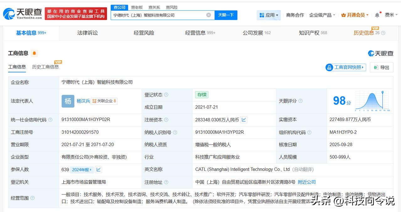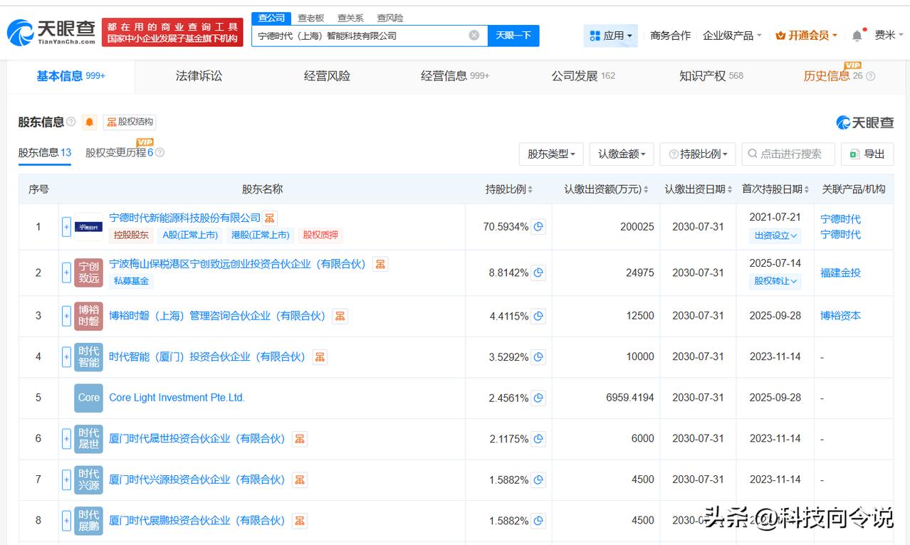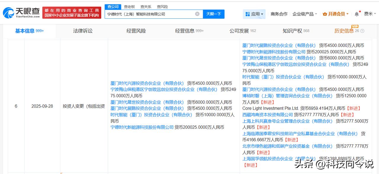 【宁德时代上海智能科技公司增资至约28.3亿增幅约13%】 天眼查工商信息显示