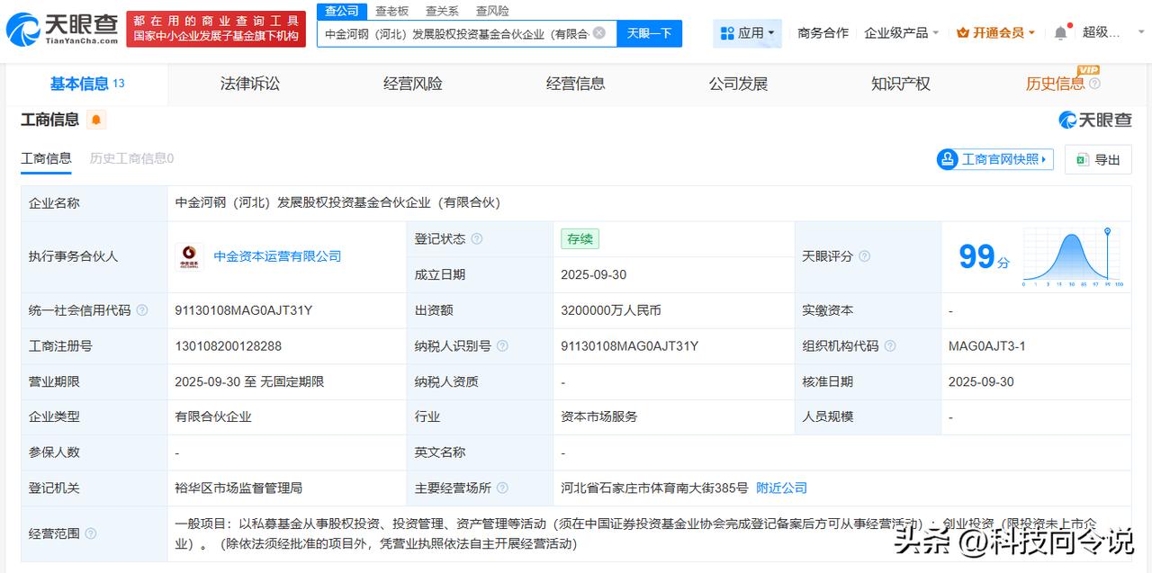 【河钢集团、中金资本成立股权投资基金出资额320亿】 天眼查App显示,近日,
