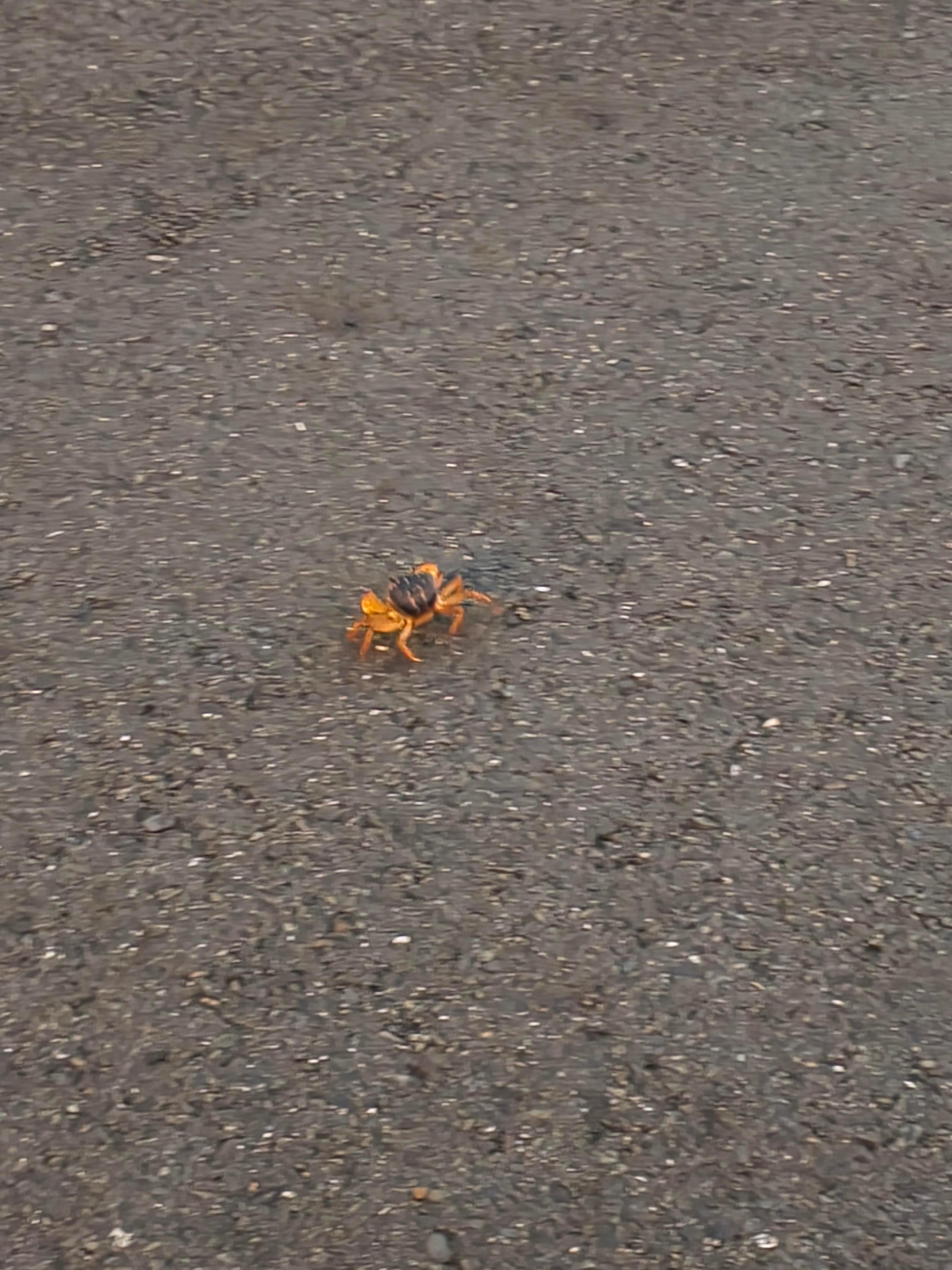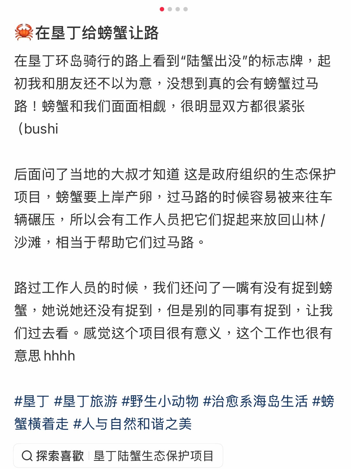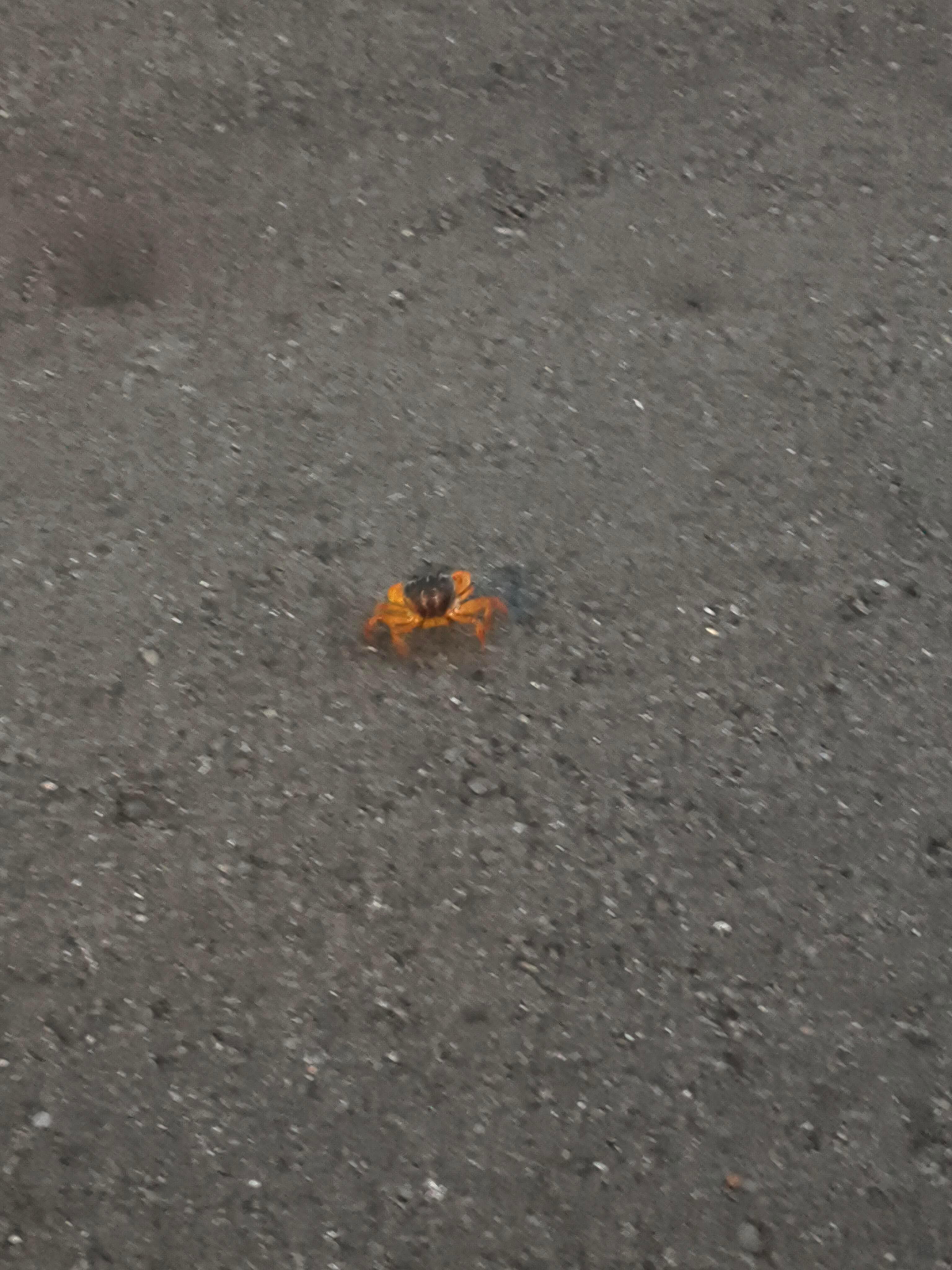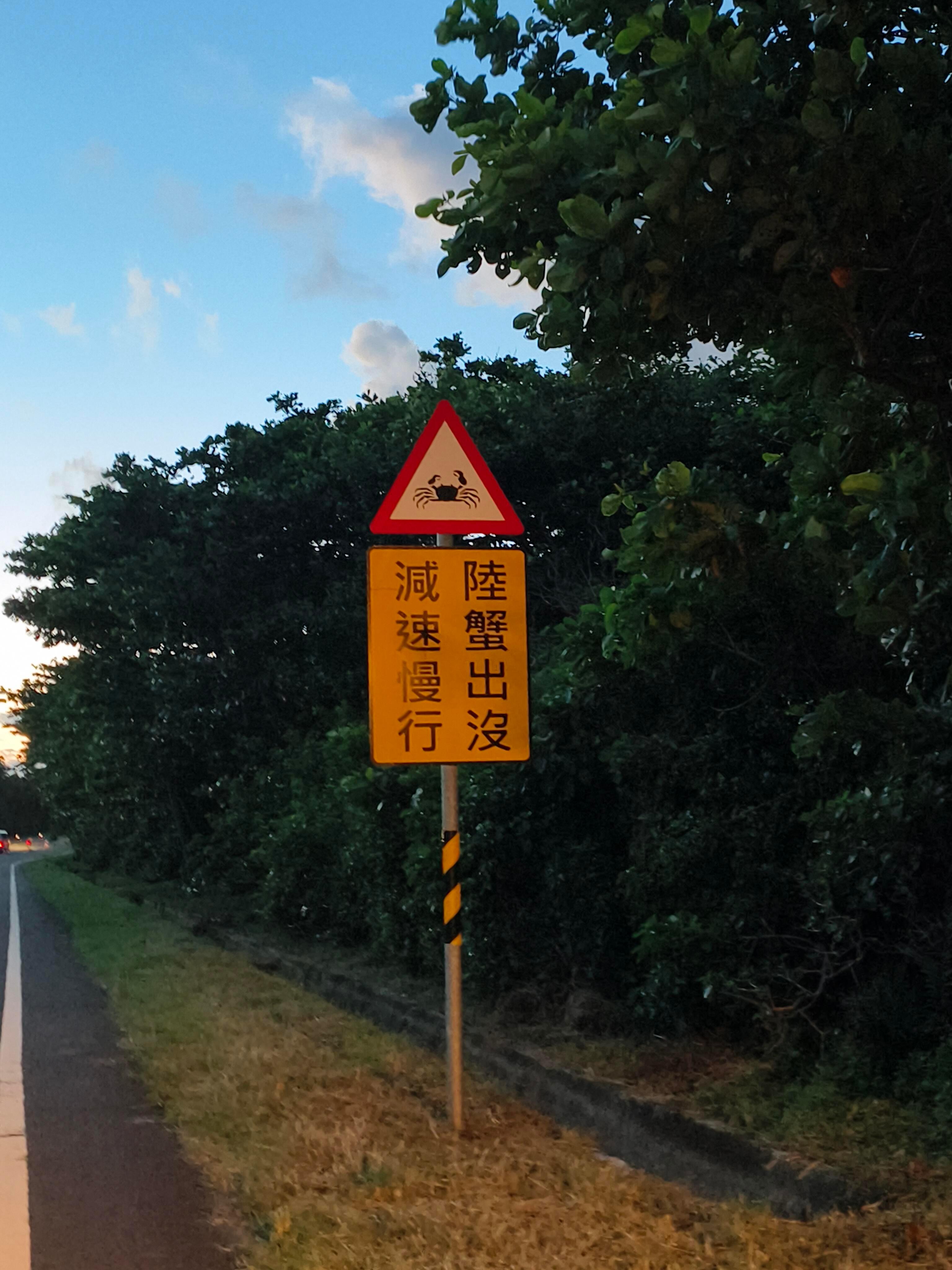 螃蟹和我们面面相觑,很明显双方都很紧张🤣这是政府组织的生态保护项目,螃蟹要上岸产卵,过马路的时候容易被来往车辆碾压,所以会有工作人员把它们捉起来放回山林/沙滩,相当于帮助它们过马路。
