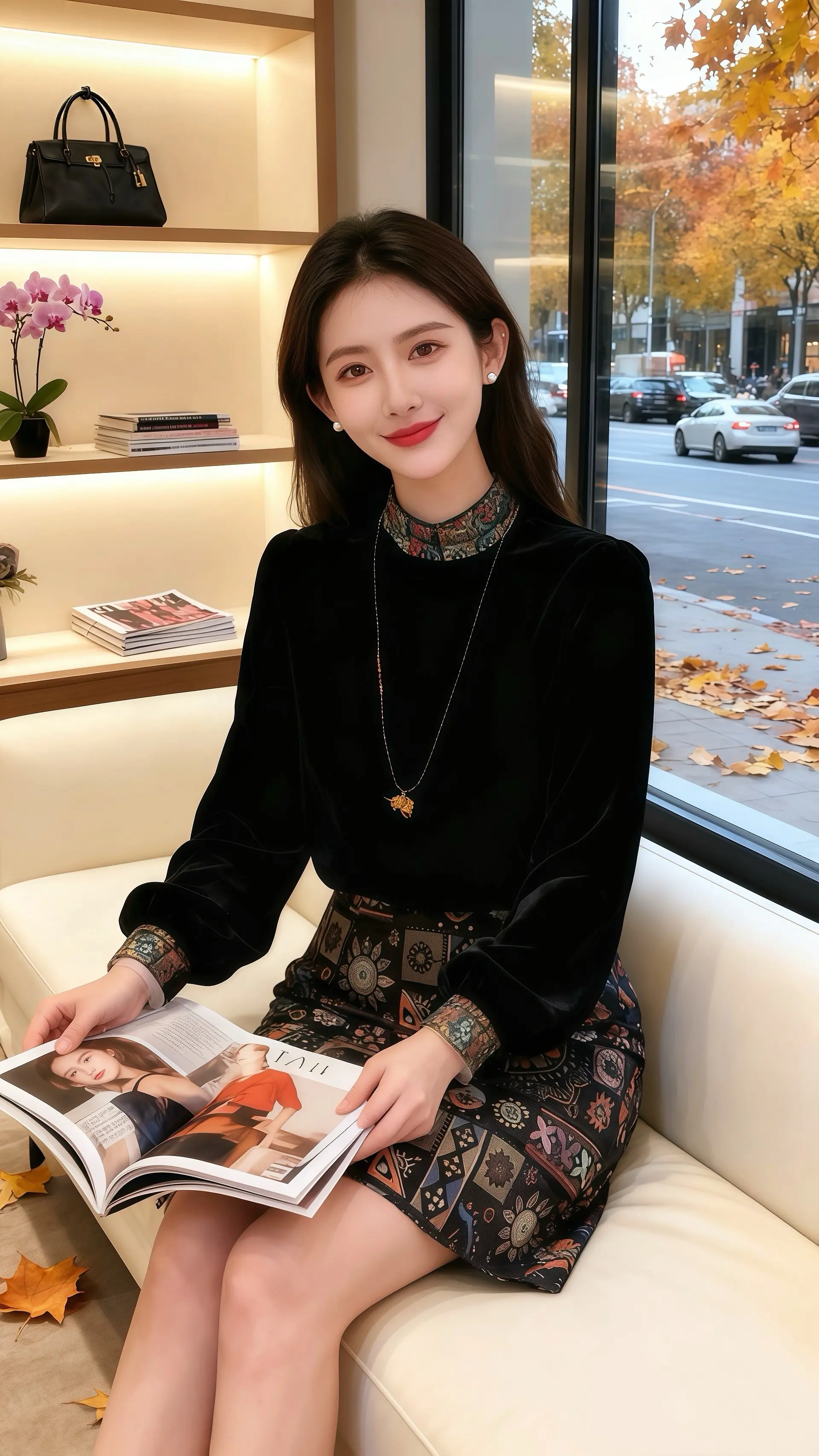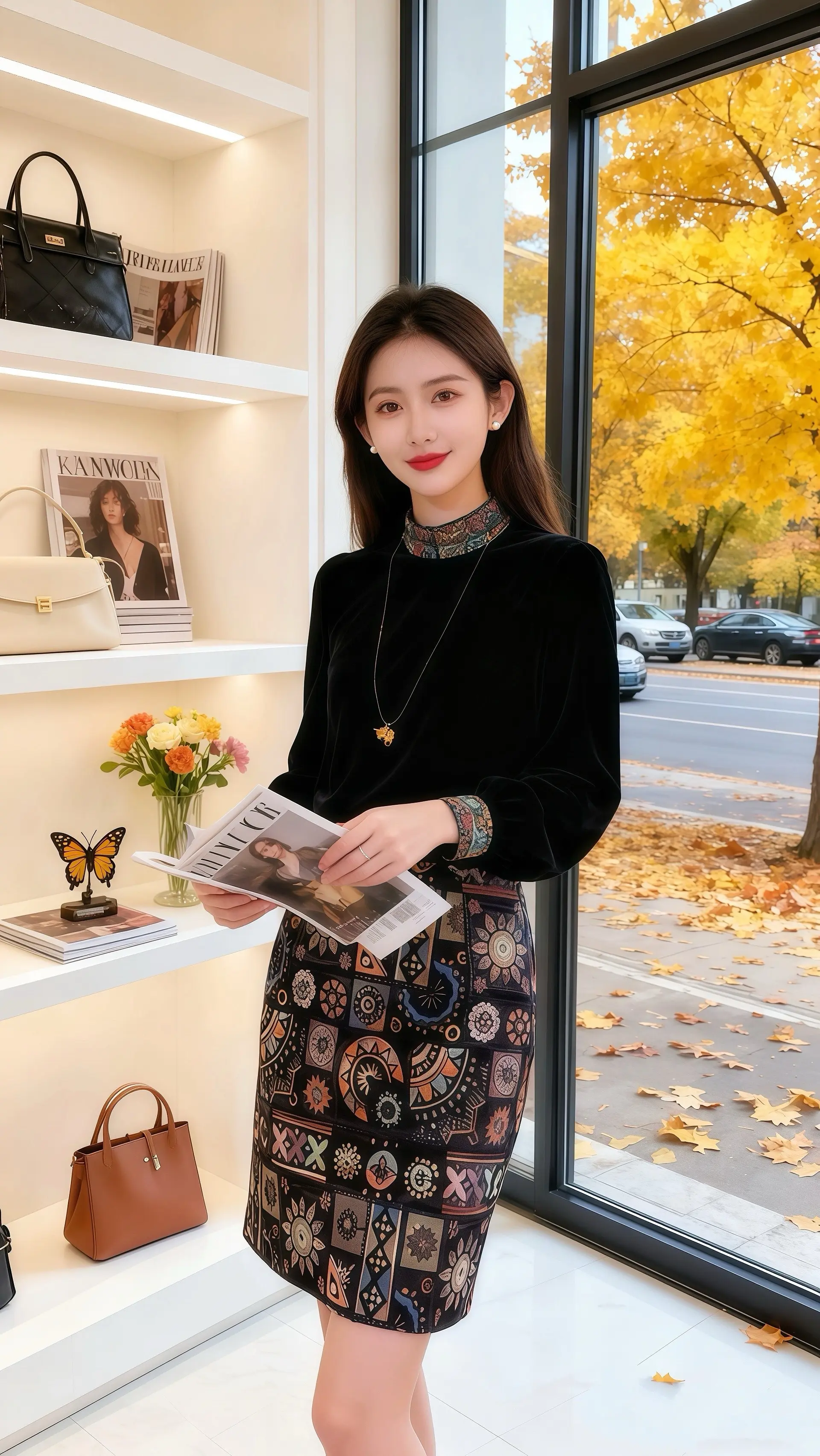 此刻她捧着时尚杂志,在摆满包包与花艺的置物架旁驻足。窗外落叶簌簌,车辆穿梭成流动的背景。她想起初开店时,也是这样一个秋日,她执着地将艺术感与实穿性揉进每一套搭配,就像此刻身上这件丝绒上衣与印花半裙,在复古与摩登间找到了恰好的平衡。