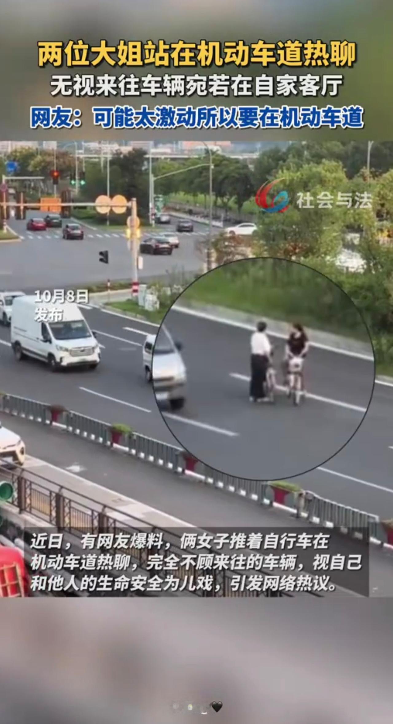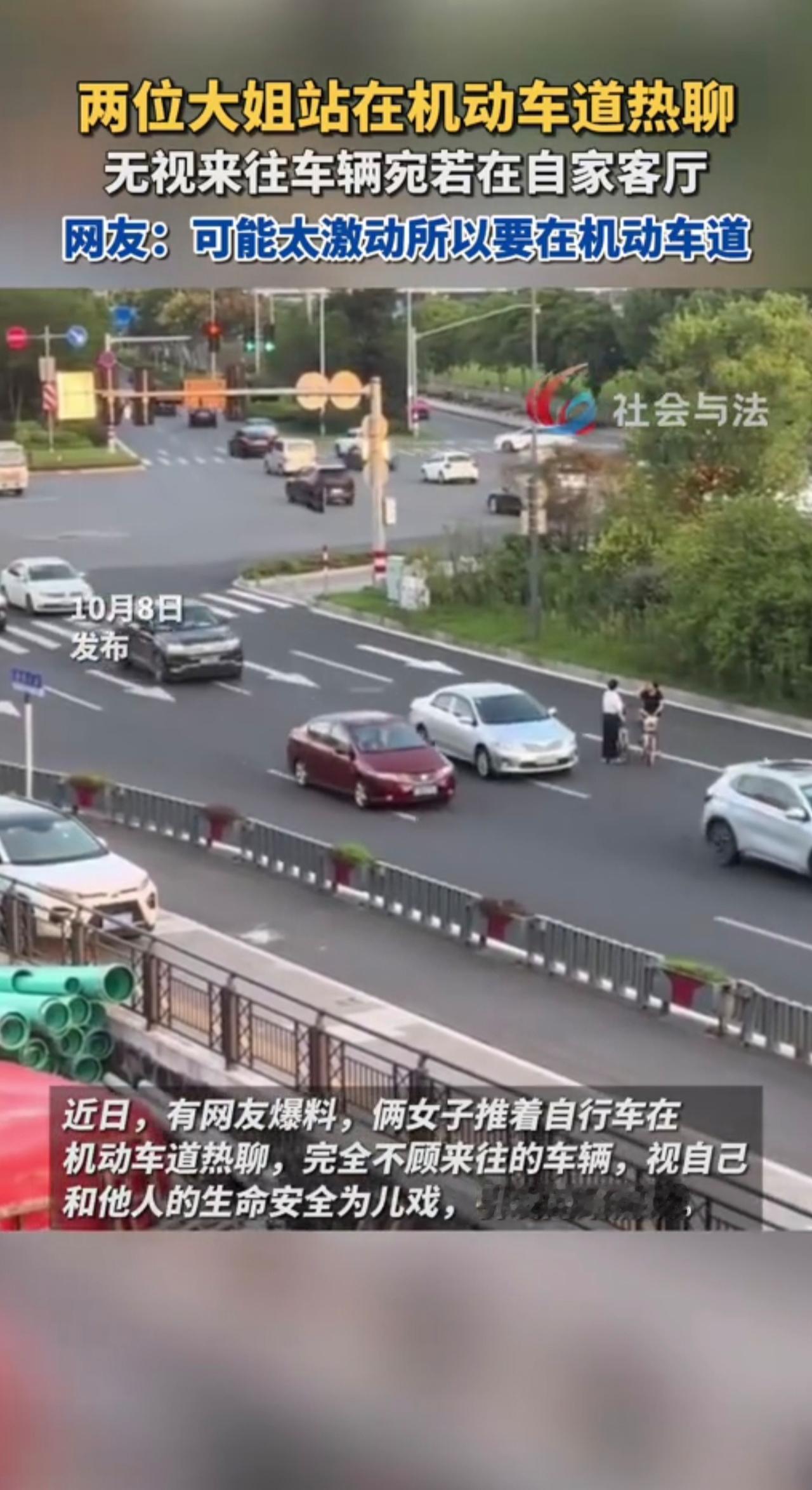 两位大姐站在机动车道热聊,无视来往车辆宛若在自家客厅