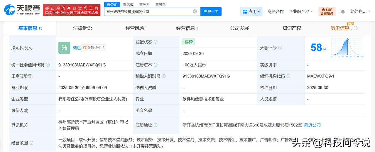 【腾讯在杭州成立新科技公司 注册资本100万】 天眼查App显示,近日,杭州光跃互娱科技有限公司成立,法定代表人为陆遥,注册资本100万人民币,经营范围为软件开发,信息技术咨询服务,技术服务、技术开发、技术咨询、技术交流、技术转让、技术推广,广告制作,广告发布,广告设计、代理,软件销售。股东信息显示,该公司由腾讯科技(上海)有限公司全资持股。 天眼查信息:
