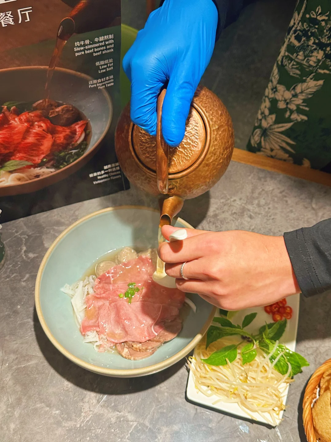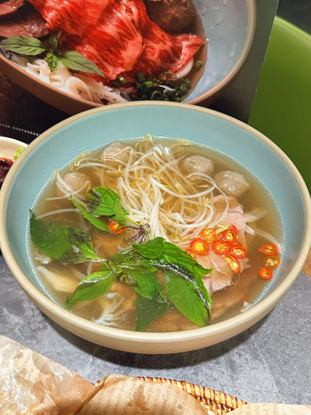 汤底清亮,是用牛骨和香料熬出来的,鲜得自然