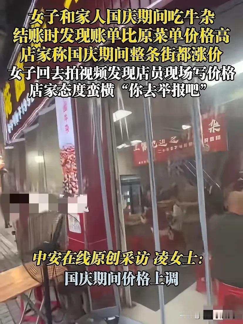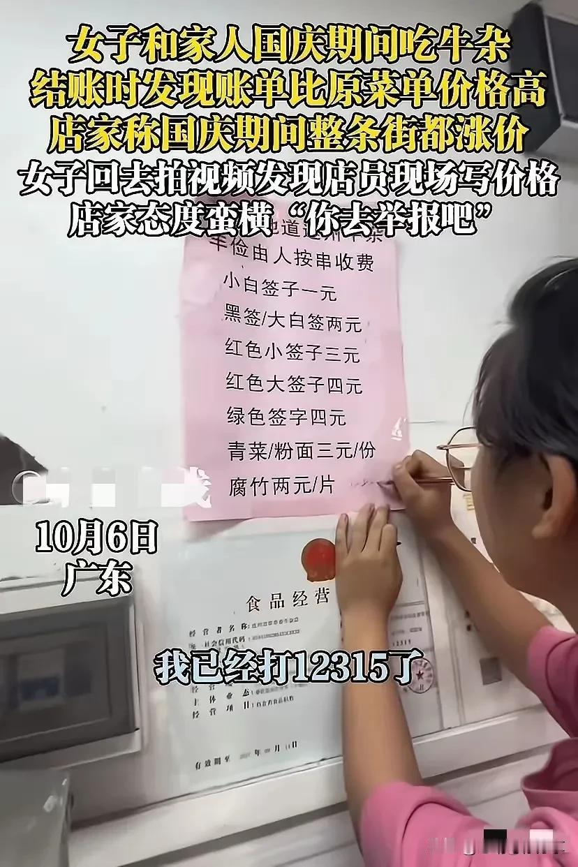 广东清远的这家牛杂店现在应该肠子都悔青了吧, 为了多赚那50元,被罚款3500元,真的值得吗? 10月4日,有消费者到连州市某牛杂店消费,结账时发现总价与店内公示的价目表不符 。店家称国庆期间整条街都涨价,并催促消费者买单,消费者最终支付了203元 。之后消费者拍照取证时,目睹店员当场用笔在价目表上添加“国庆涨价”字样,还叫嚣让消费者去举报! 结局很舒适,消费者举报了,该店家被要求退还多收的50元,并且还被罚款3500元! 何必呢?事先讲清楚不好吗?非得硬刚,踢铁板上了吧!为了多赚那50元,里子面子都没了,不仅被罚款,口碑也毁了,以后谁还敢来你家吃饭? 现在后悔也没用了,现在全网都知道了,都会避雷了,早知今日,何必当初呢? 典型的捡了芝麻,丢了西瓜! 做生意最讲究的不就是诚信吗?诚信都没了,生意离黄也不远了! 大家觉得呢?