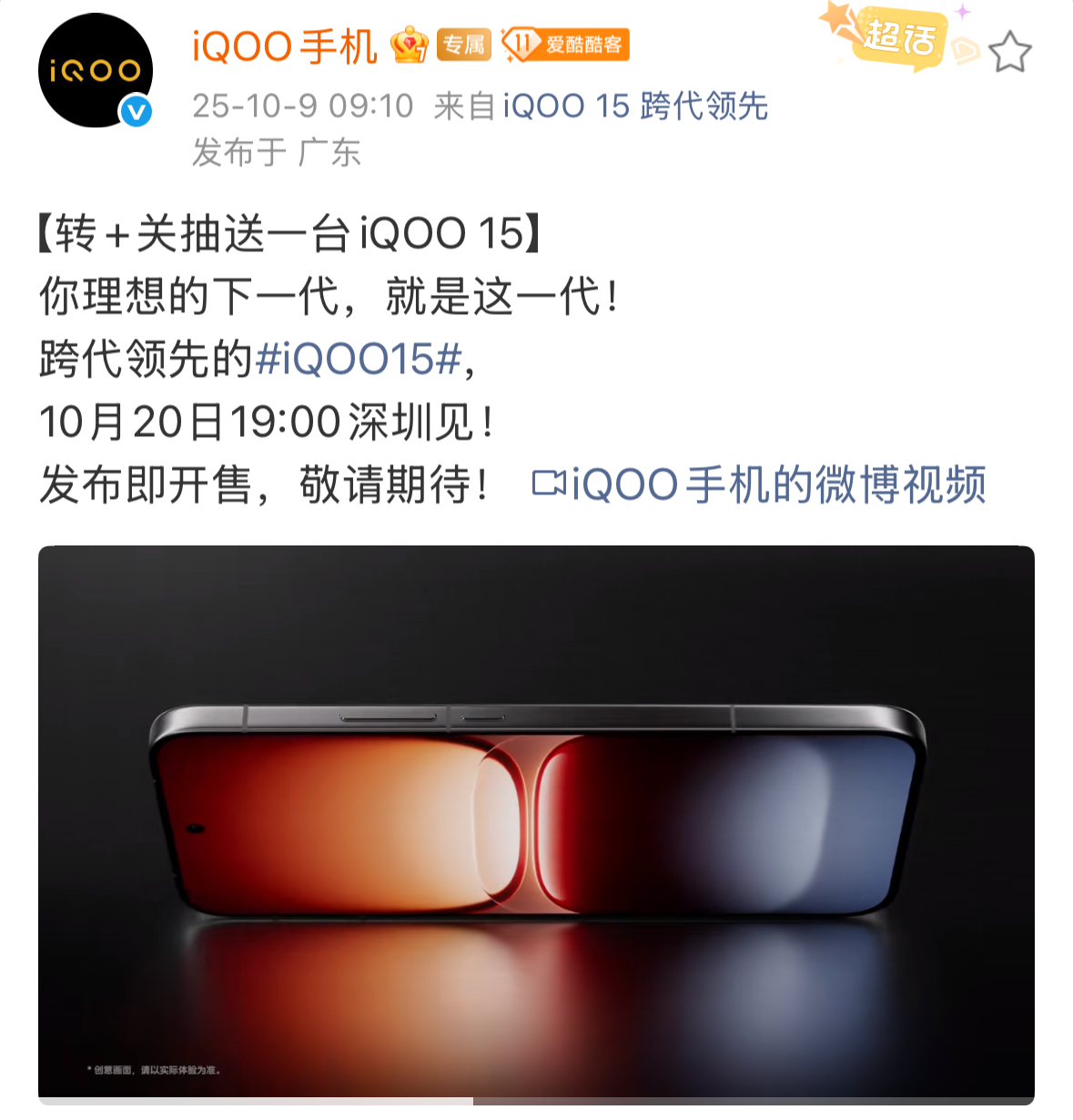iQOO 15官宣定档,10月20日正式发布,这次有凌云、传奇版、赛道版和旷野4个配色,「凌云」配色最特别,蛮期待真机效果。对于这台新机,最期待的部分毫无疑问就是游戏体验,毕竟2K三星珠峰屏不是盖的,M14发光材料 + LEAD OLED技术 + 144Hz高刷 + 3200Hz触控,参数很顶啊。至于性能更不用愁,第五代骁龙8至尊版 + 自研电竞芯片Q3加持,2K + 144帧超分超帧并发,还有全场景光追,25年最强游戏体验稳了,我们永远都在说下一代最强,要等下一代,我觉得iQOO 15这次要让我们破戒了,因为这一代就是下一代!关键发布即开售,想抢首发的可以先去官网或电商旗舰店蹲预约福袋,游戏党必冲!
