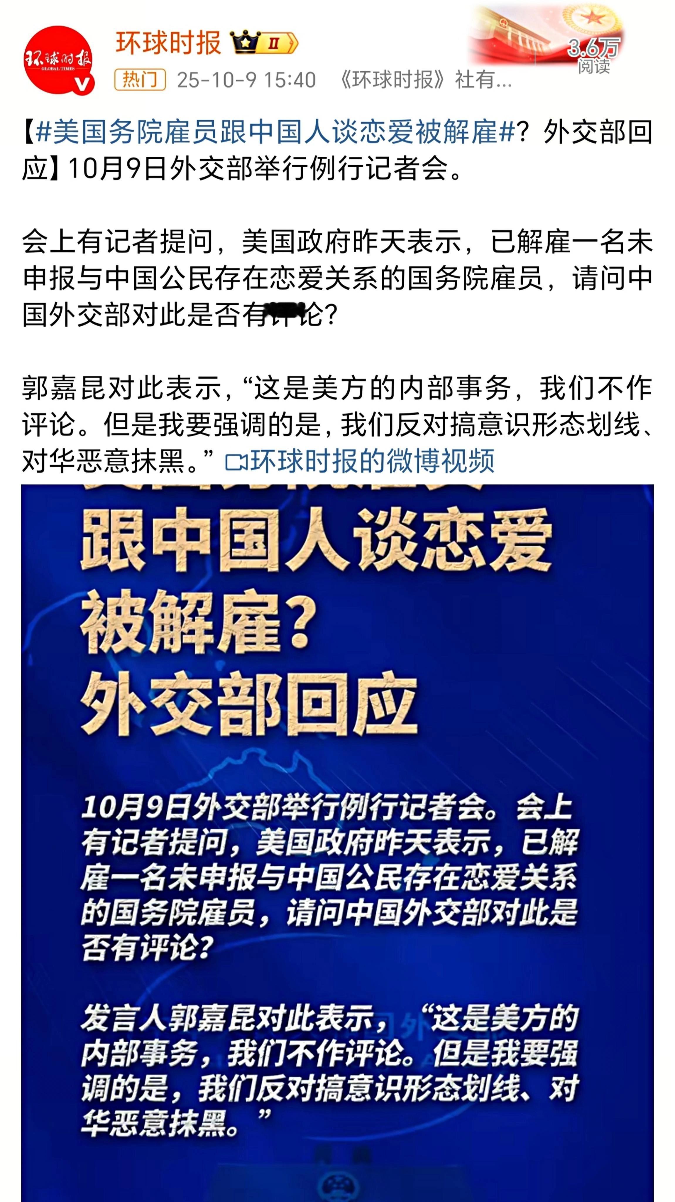 关于美国国务院解雇一名未申报与中国公民存在恋爱关系的雇员一事,中国外交部发言人郭嘉昆在2025年10月9日的例行记者会上作出了回应。他表示,“这是美方的内部事务,我们不作评论。” 但他同时强调,“我们反对搞意识形态划线、对华恶意抹黑。”