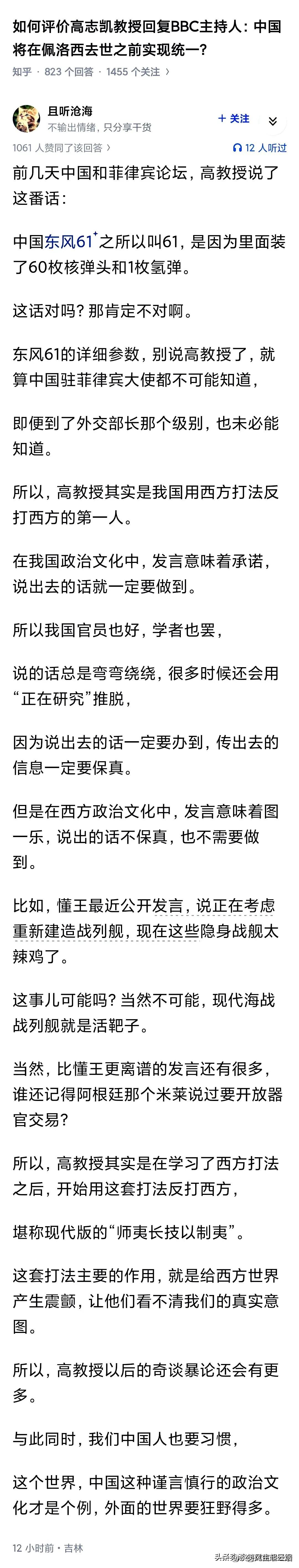 高志凯教授的话语,其实就是真真假假的套路和忽悠,尤其是关于东风61的解释,反正就是恐吓和忽悠并存。其实多年来咱们一直韬光养晦,就需要高教授这样的喉舌,来展示不一样的强势外交风格。 以前局座的各种忽悠,完全是为了掩饰咱们的经济发展和军事发展,起到了重要作用,完全忽悠的对手不知何故。那是咱们发展军事能力的关键是,局座真的做到了掩饰实力。 现在时代不一样了,局座不用掩饰实力的存在,就需要高教授来释放实力的强大。反正就是一刚一柔,刚柔并济的对外输出,真的做到了震慑各方。 高教授的风格,跟局座完全不一样,跟金政委也不一样。高教授是完全的怼回去的风格,谁也不服,谁也别想占便宜的风格,那是看着很爽。 某一方面上,高教授的存在,将大国实力释放出来,事半功倍。本质上都是忽悠和恐吓敌国,但是高教授明显要让人看着更高兴一些。