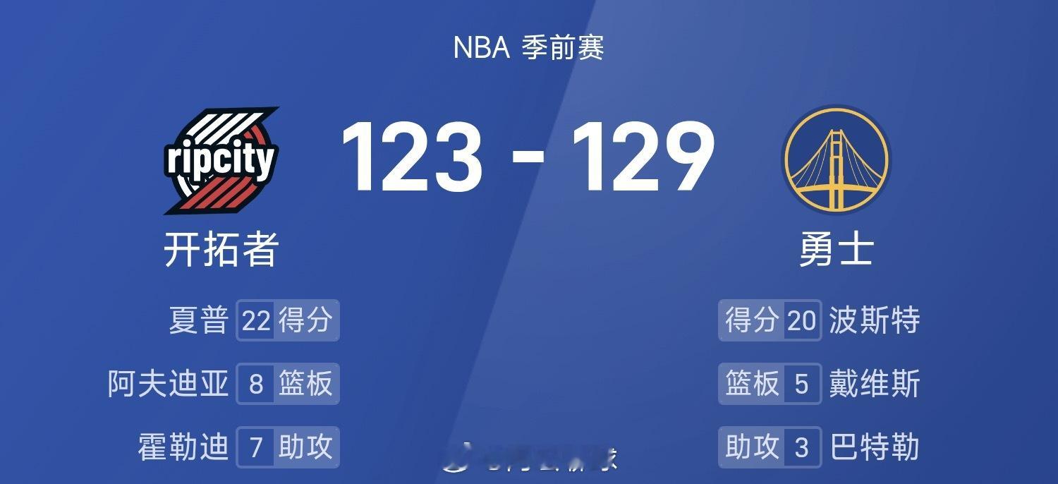 NBA季前赛:杨瀚森4+4&6犯,波斯特20分,勇士129-123开拓者NBA你我皆主角