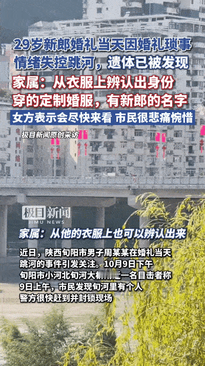 此前在婚礼当天跳河的男子,遗体已被寻获。 听闻他是与家里人产生矛盾,一时想不开才跳入河中。搜救人员搜寻多日,最终在下游发现了他。 一场好好的婚礼落得这般结局,亲戚朋友都悲痛不已。大家也纷纷表示,遇到事情切勿钻牛角尖,生命最为重要。新郎跳河 陕西新郎跳河 跳河自杀