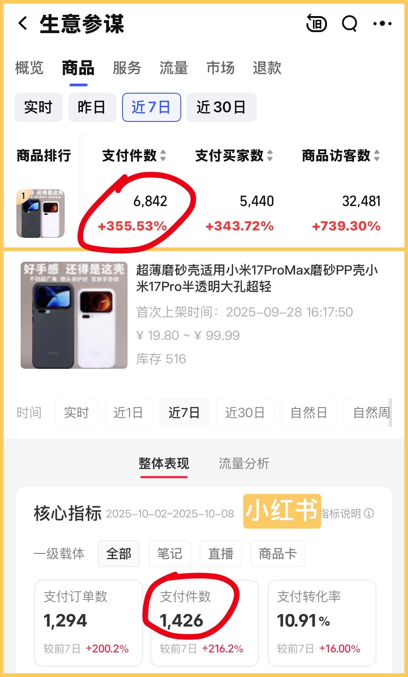 小米17Pro/17ProMax 超薄壳,最近七天10月2日到8囸,累计卖了8268个,平均日均1181个。